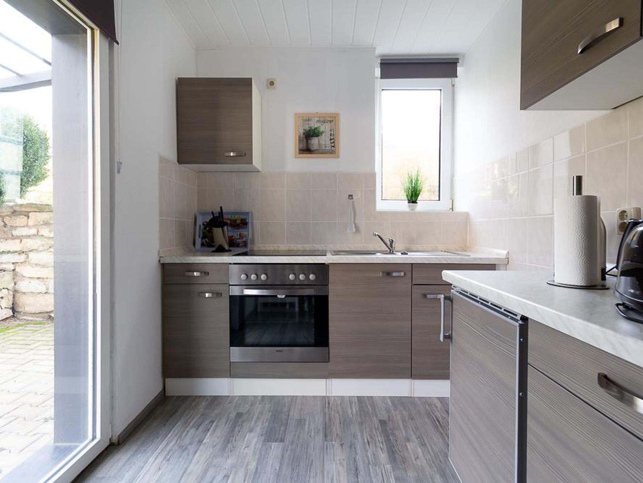 Die Ferienwohnung verfügt über eine komplett eingerichtete Wohnküche mit Geschirr, Kaffeemaschine, Wasserkocher, Elektroherd und Küchlschrank mit Gerfrierfach.