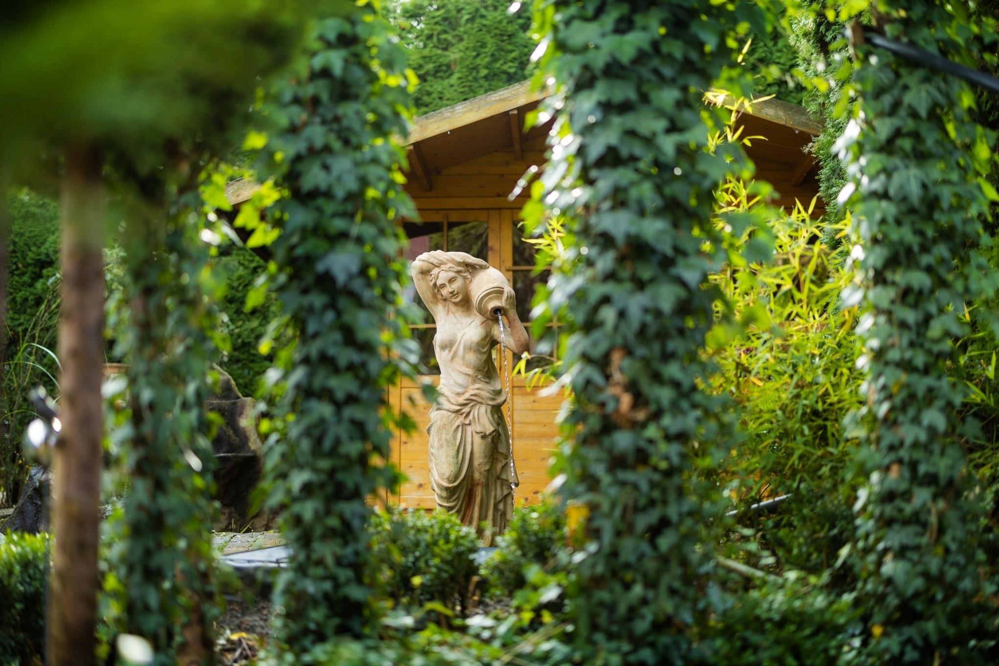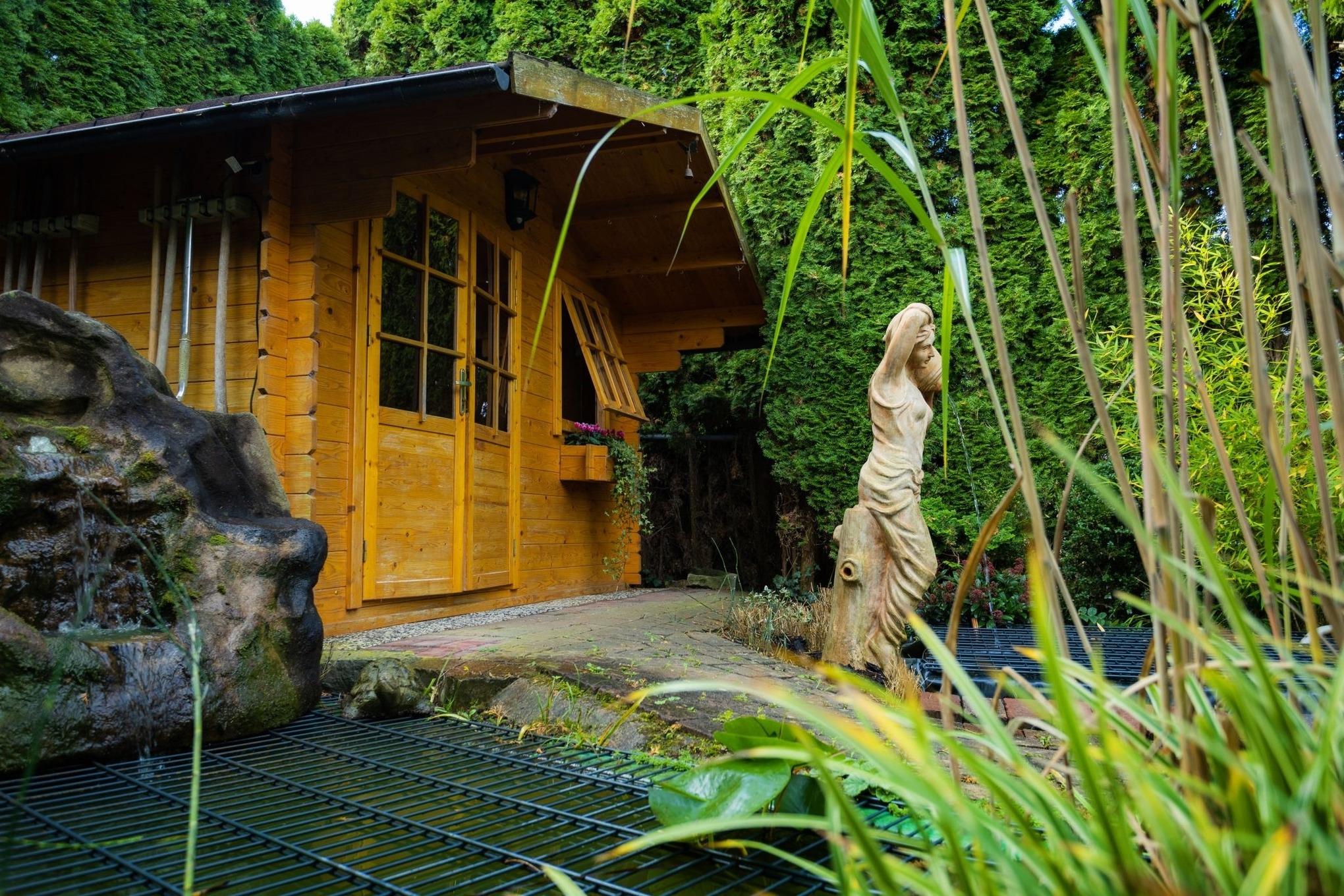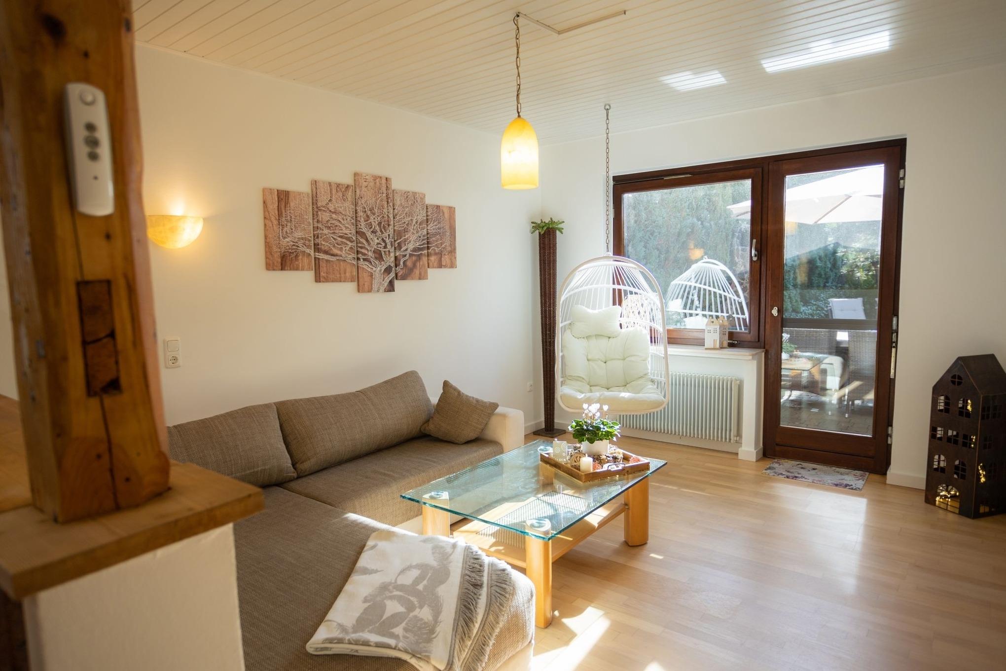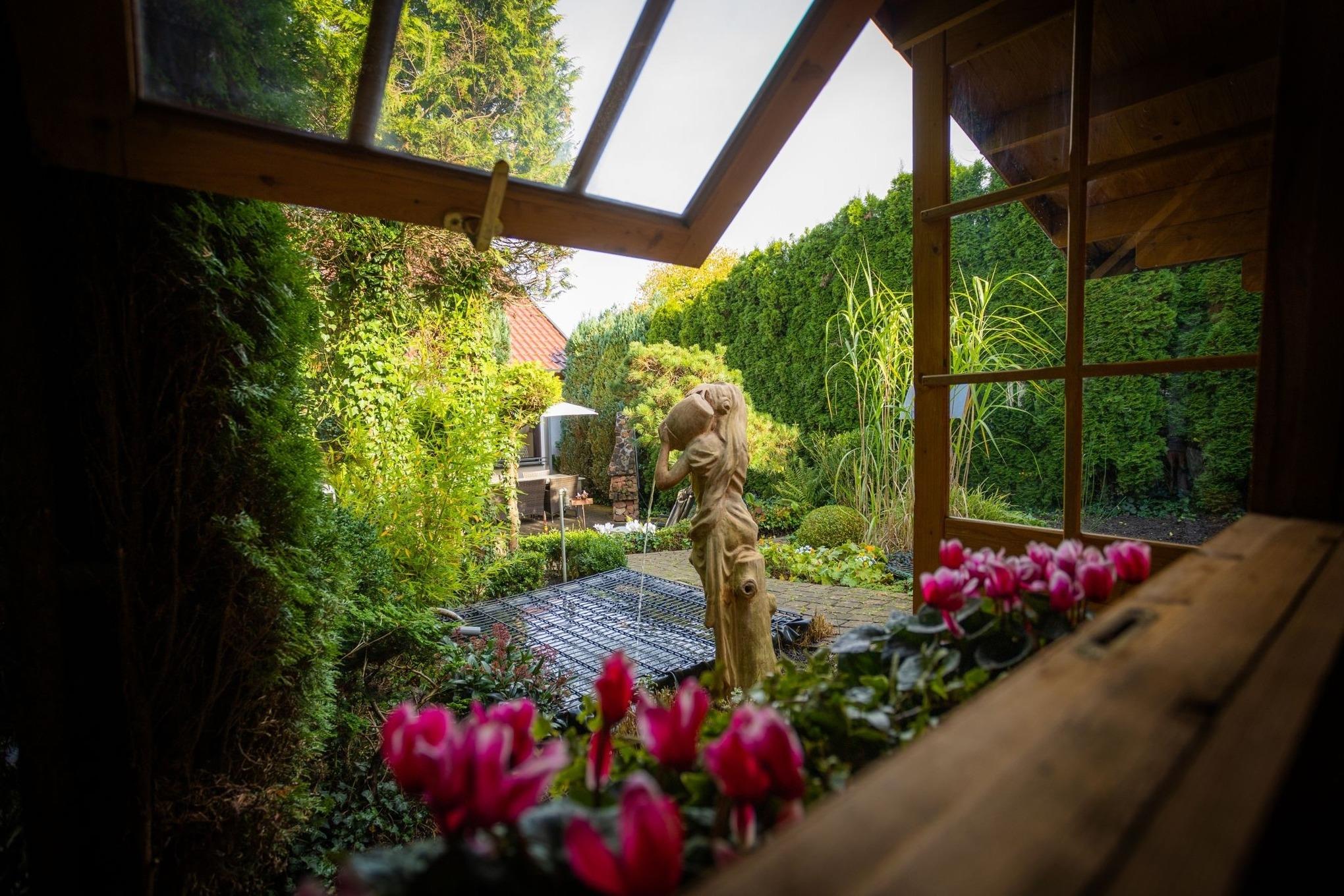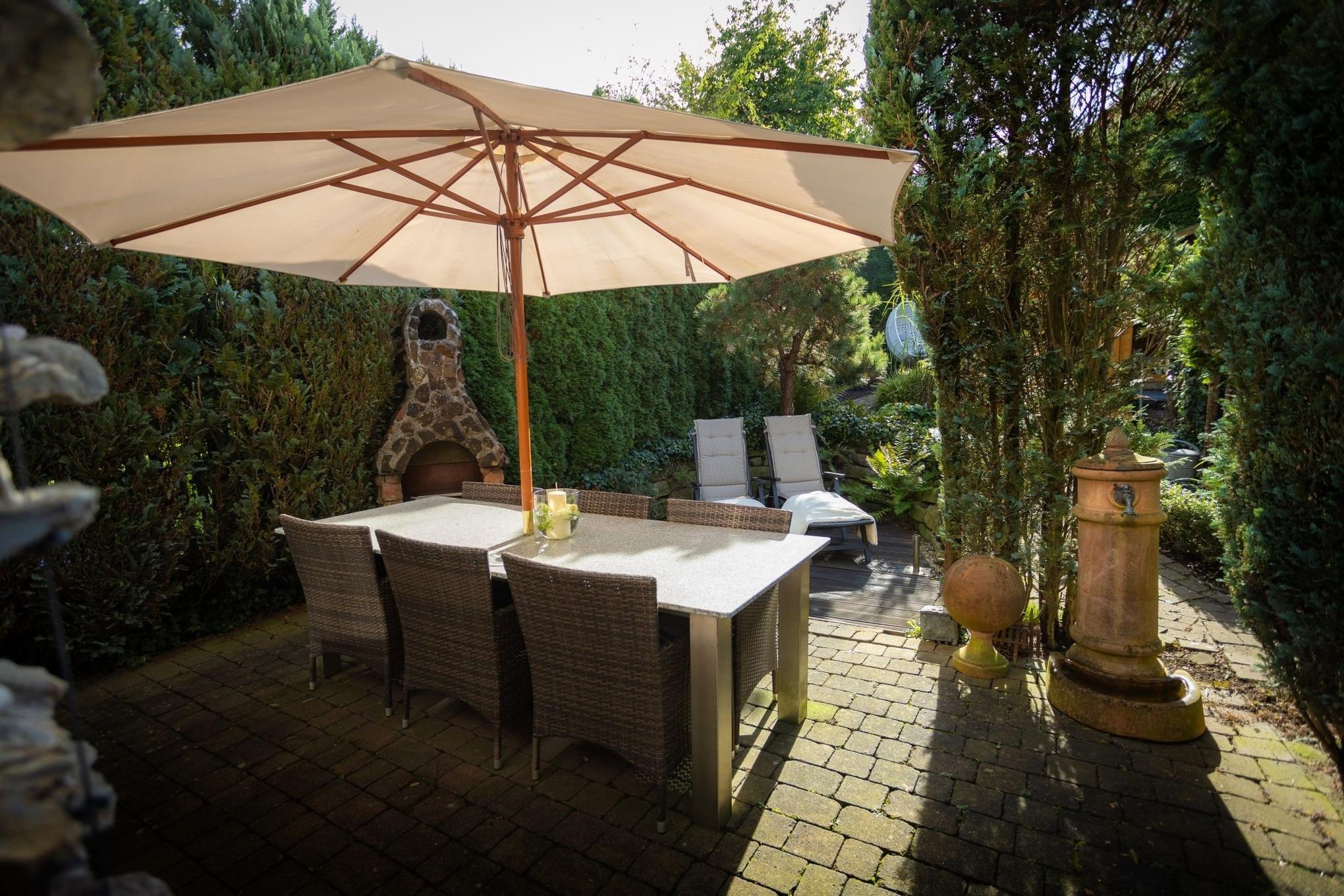 Das Besondere: Der Garten mit Terrasse, zwei kleinen Teichen und dem leisen Plätschern von Wasser. Hier entsteht sofort eine Atmosphäre, die Ruhe schenkt – mitten in Bad Wünnenberg und doch ganz privat.