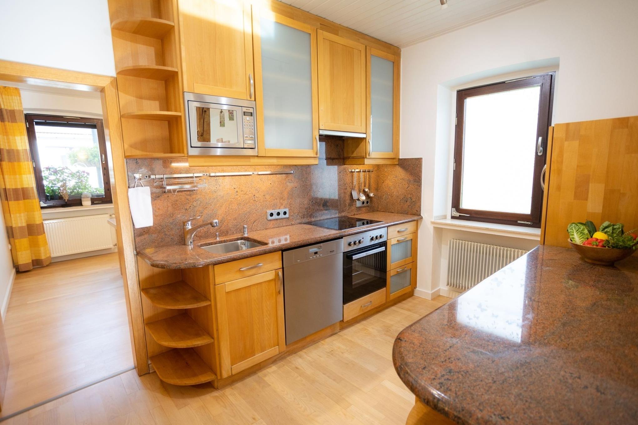• Selbst kochen statt teuer essen: Voll ausgestattete Naturholzküche spart Geld und bietet Flexibilität.