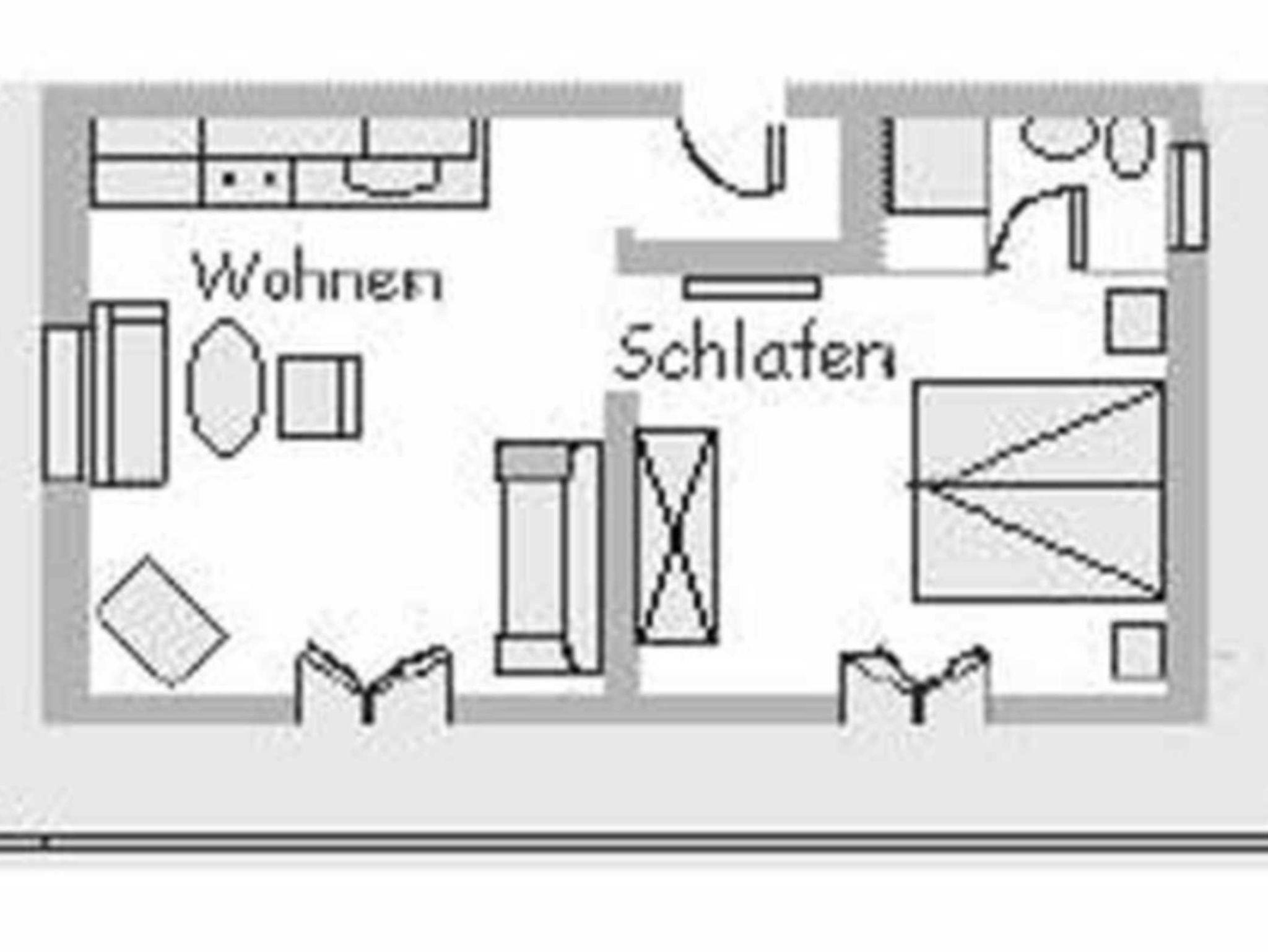 2-Raum-Ferienwohnung für 1-2 Personen, 46 qm, 1. Obergeschoß, ein Schlafzimmer, ein Wohnzimmer mit Schlafcouch, Balkon nach Nord, Ost und Süd mit Sitzgruppe
