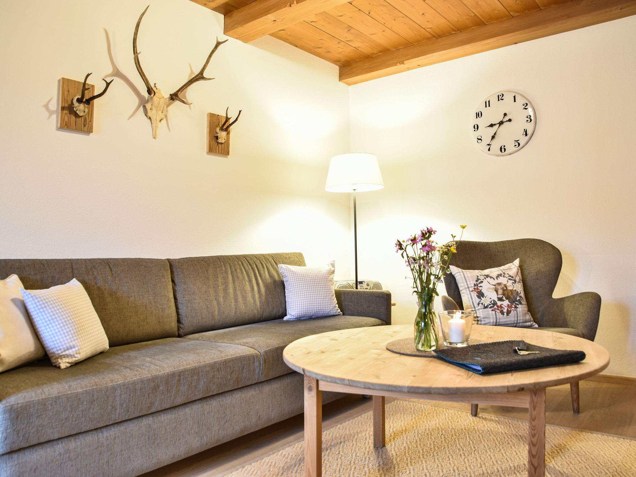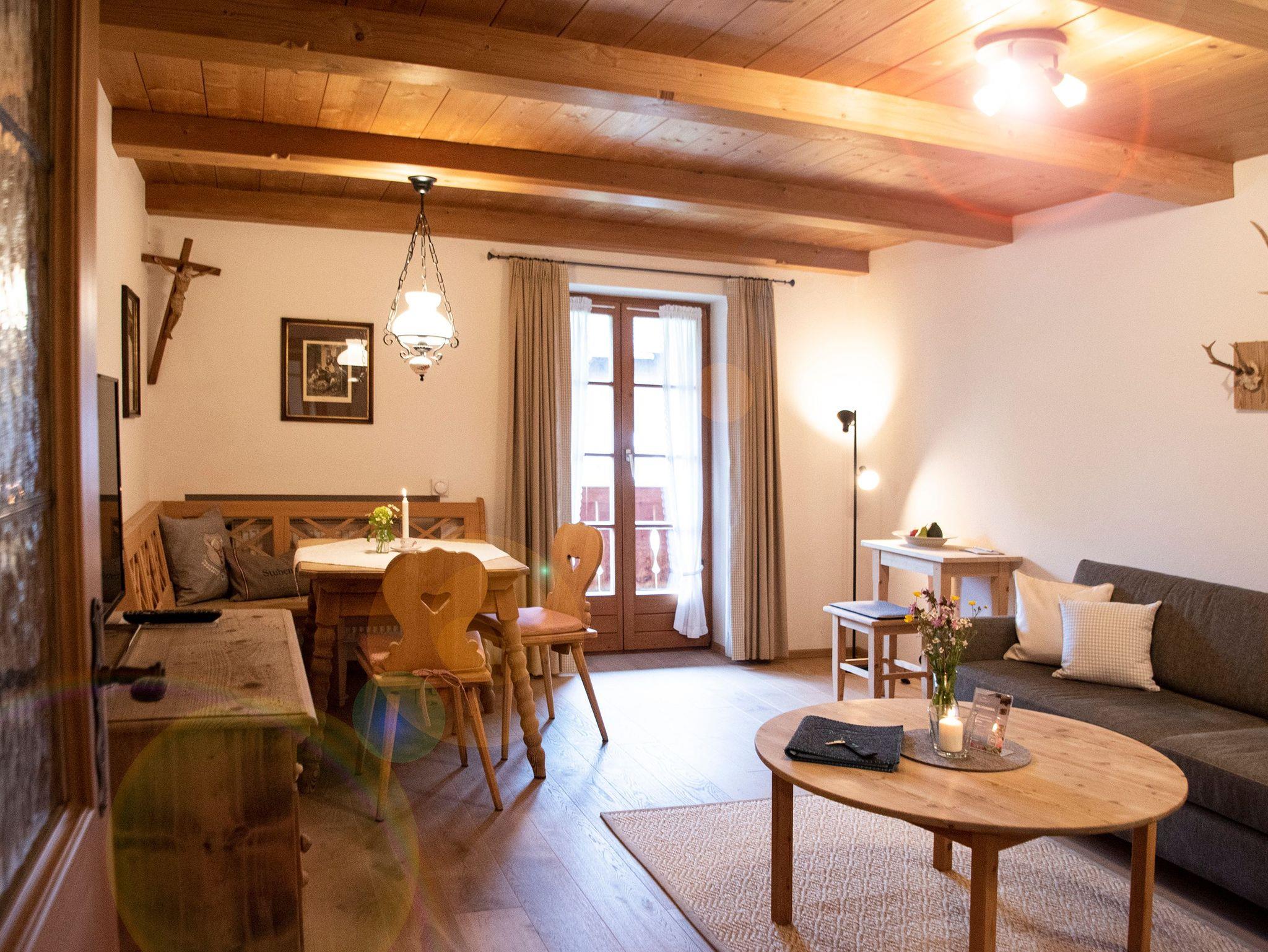 Unsere gemütliche und urige Ferienwohnung 'Altwiessee' für 2 Personen befindet sich im 1. Obergeschoss und bietet auf 50 m² ein separates Schlafzimmer sowie einen Süd-Balkon mit Bergblick. Mit unbehandeltem Holz ist die Nichtraucher-Ferienwohnung auch für Allergiker geeignet.