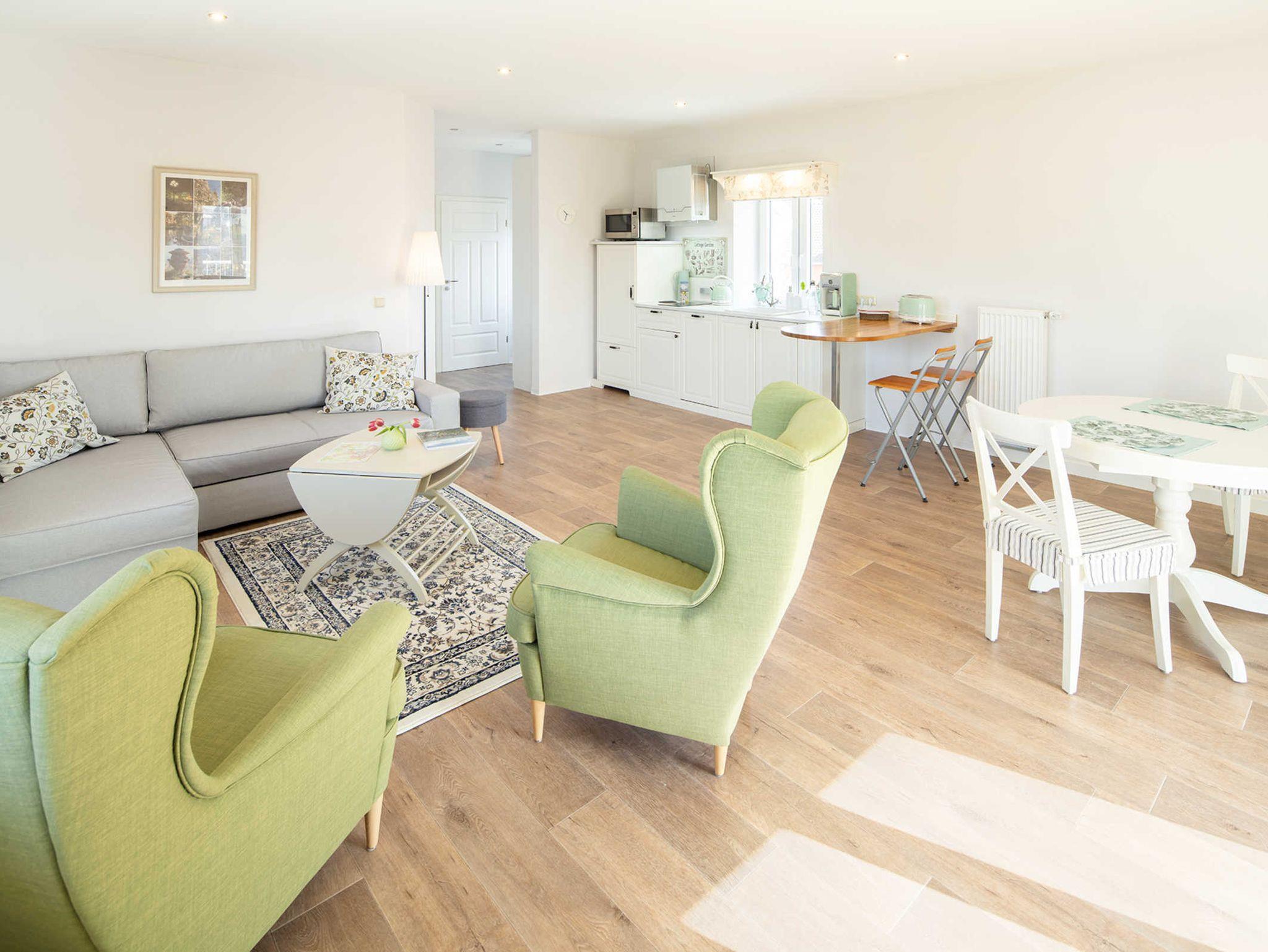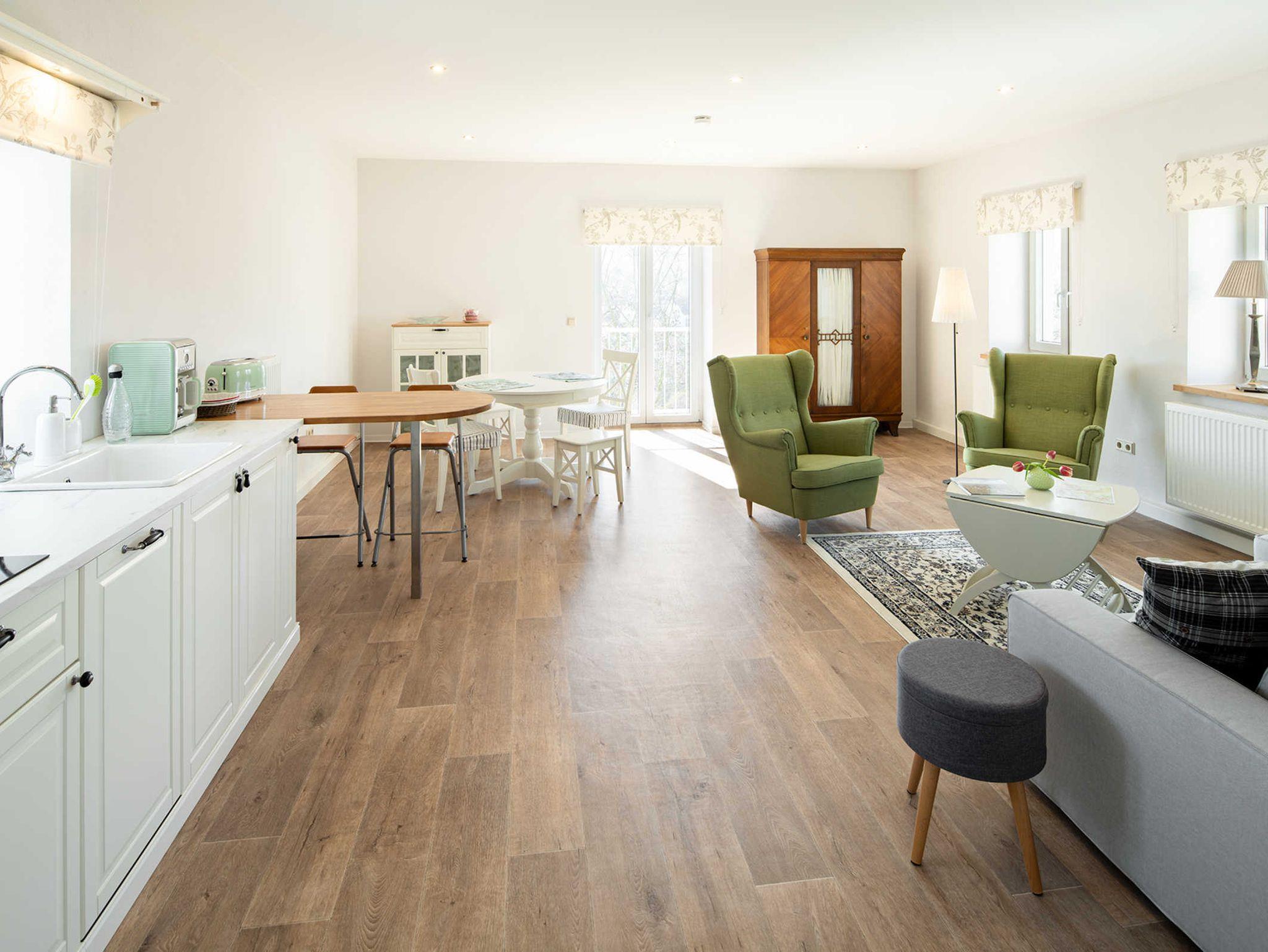 Die großzügige Ferienwohnung (55qm) verfügt über ein separates Schlafzimmer und eine Wohn-/Essküche mit allen Utensilien des täglichen Bedarfs und einer weiteren komfortablen Schlafmöglichkeit für 2 Personen.