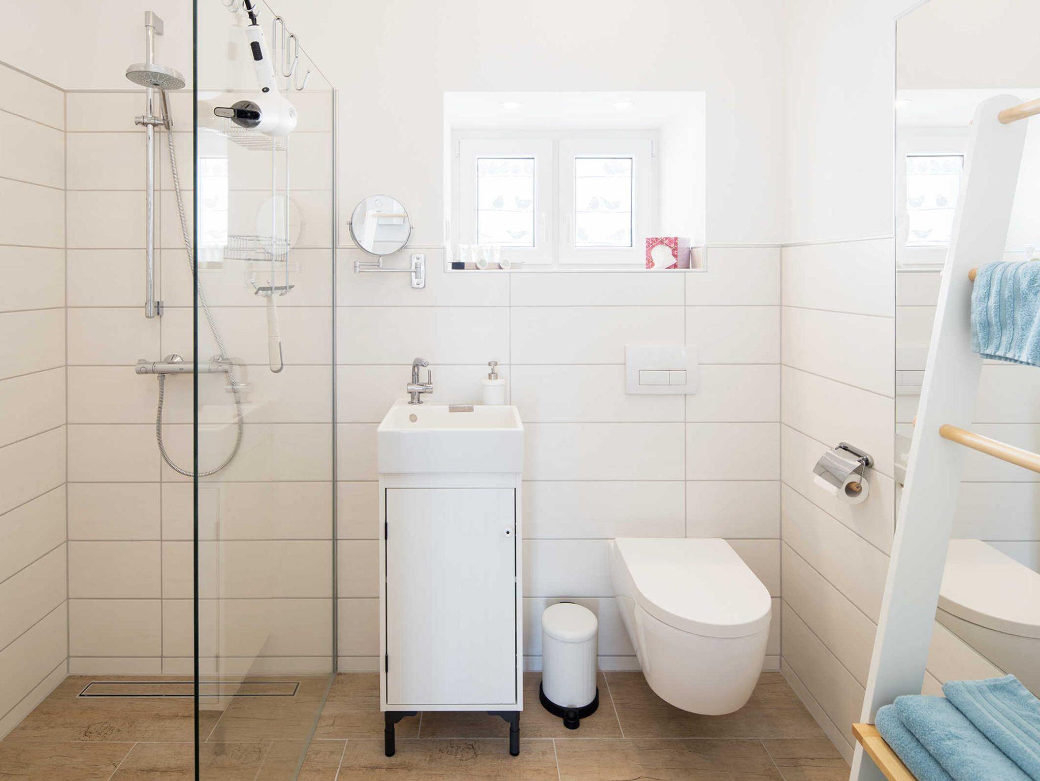 Das Badezimmer ist modernster Standard und verfügt über eine bodenebene Dusche.