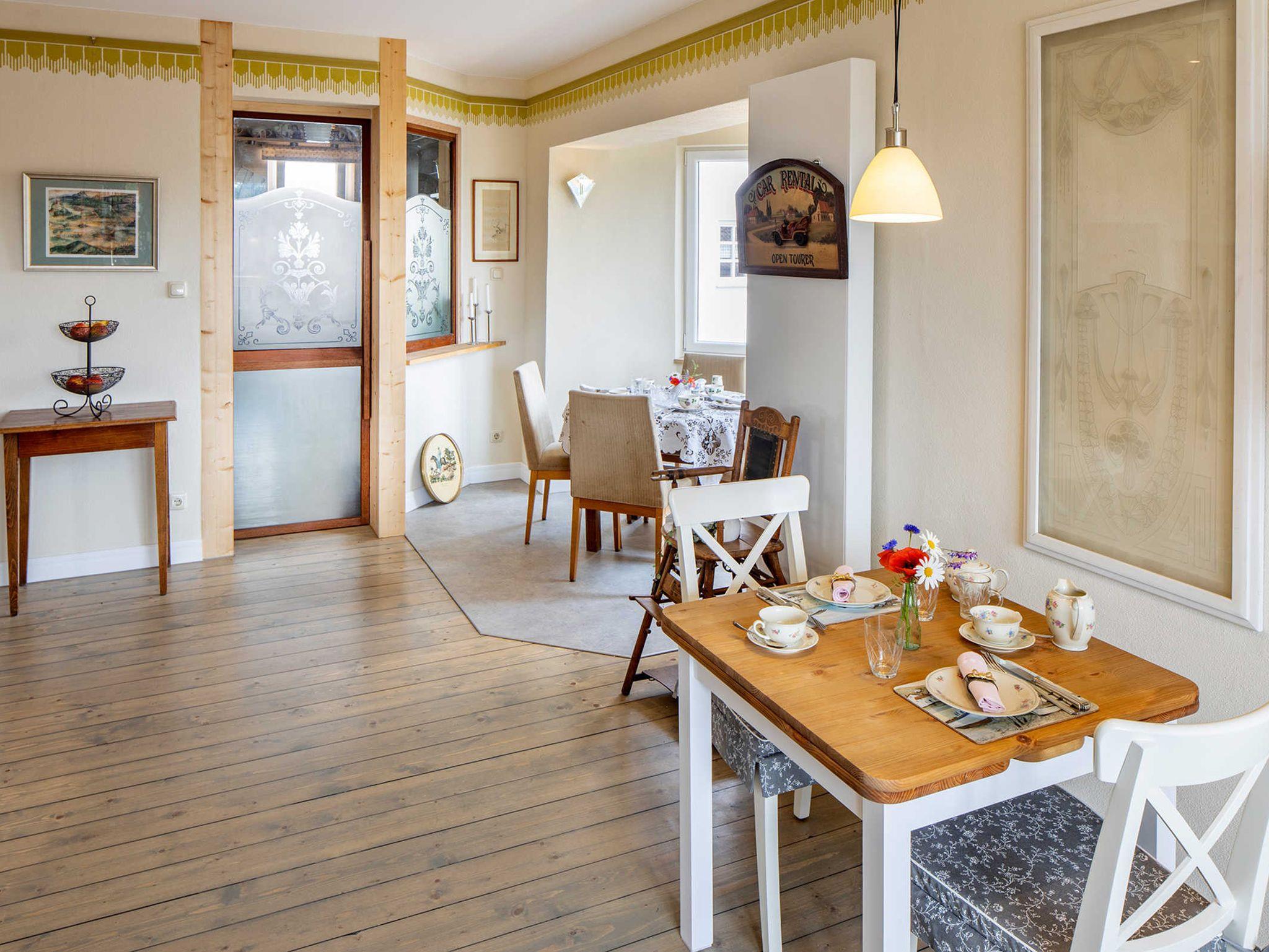 Der einladende Frühstücksraum im 1.Stock, wo das Frühstück am Tisch serviert wird, kann auch als Aufenthaltsraum genutzt werden.