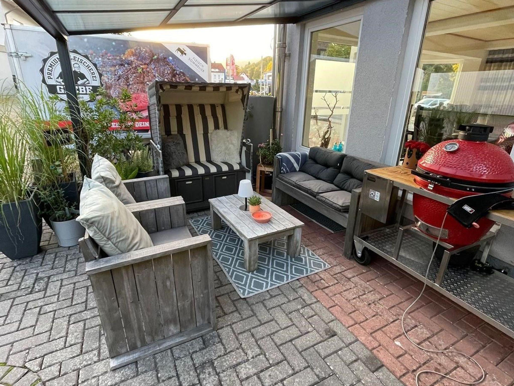 Zusätzlich steht Ihnen ein kleiner Sitzplatz mit verschiedenen Grill`s und Smoker im hinteren Gartenbereich zur Verfügung. Auf dem Grundstück finden Sie außerdem einen Stellplatz für Auto und Motorrad, auch eine Ladestation für E-Autos ist vorhanden, und Ihre Fahrräder können sicher untergebracht werden.