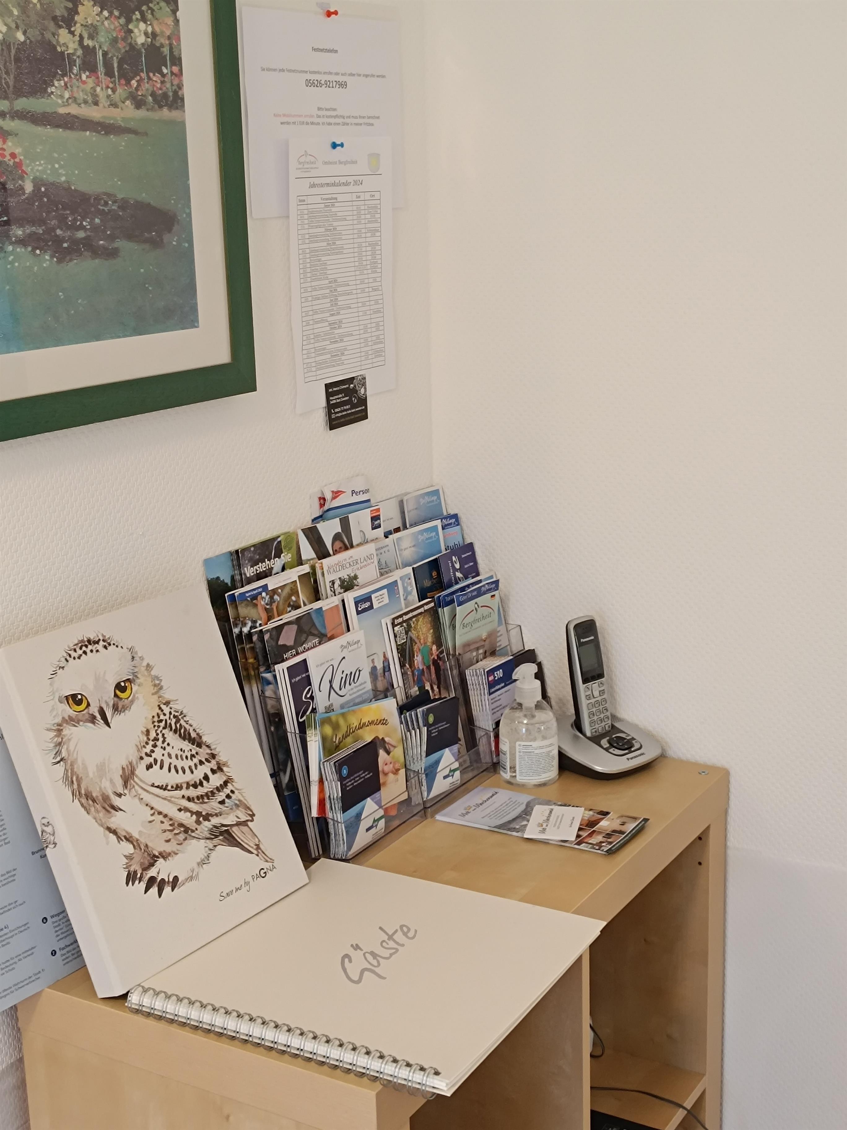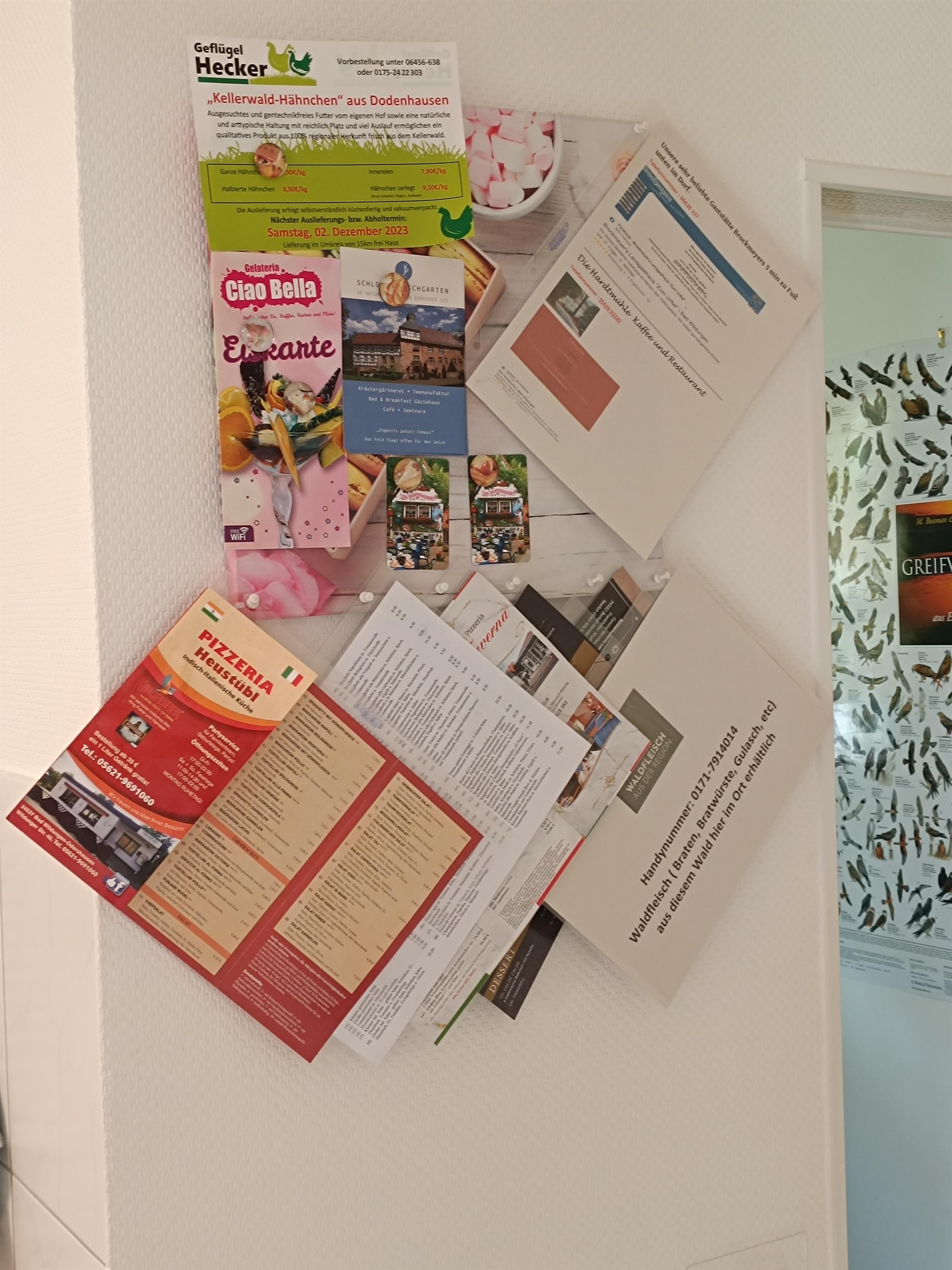 Für unsere Gäste haben wir ein sehr umfangreiches Repertoire von Prospekten, Broschüren, Fahrplänen und Karten aus dem Tourismusbüro Bad Wildungen (Landkreis Waldeck-Frankenberg) und Bad Zwesten (Landkreis Schwalm-Eder) hier ausgelegt. Ebenso befindet sich in der Küche ein Informationsbrett mit regionalen Lebensmittelanbietern sowie einigen Speisekarten.