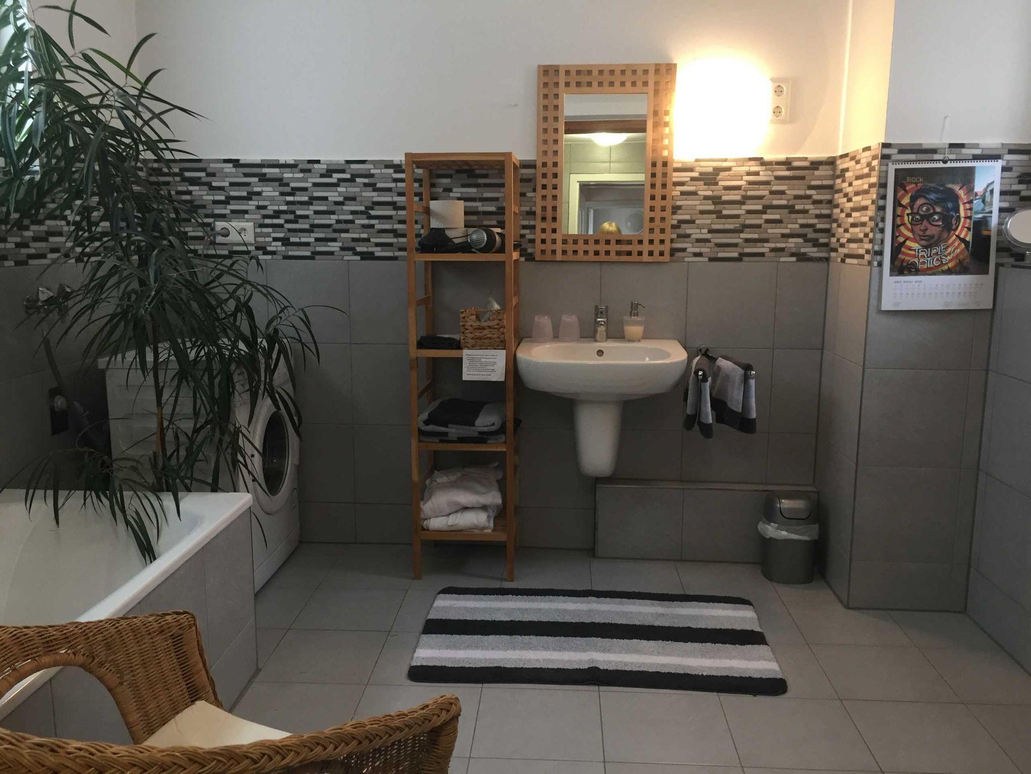 Handtuchtrockner, Bade- und Handtücher, leihweise Bademäntel, Badeutensilien, Fön, Waschmaschine, Wäscheständer, Bügeleisen, Bügelbrett vorhanden.