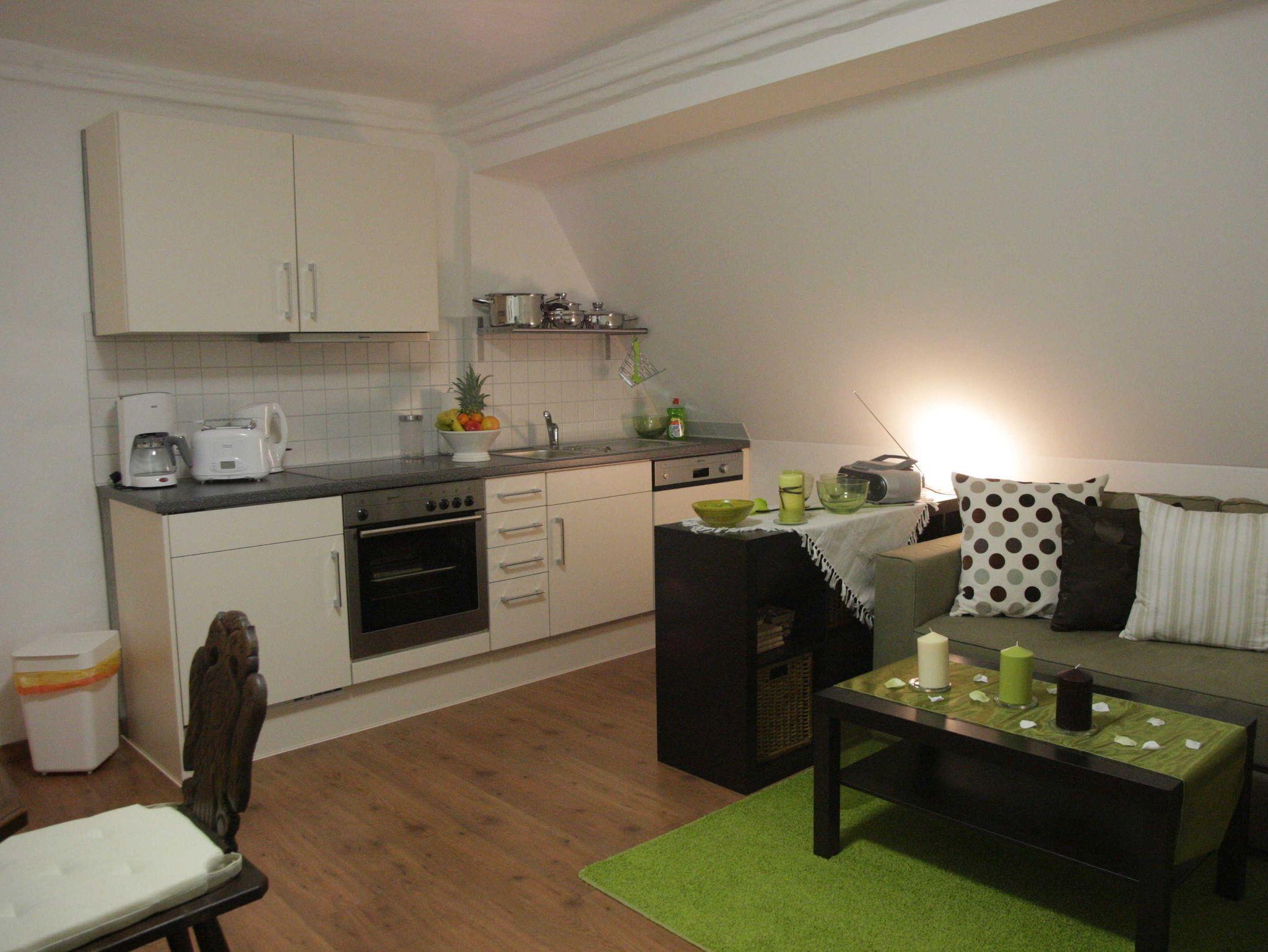 Die Ferienwohnung Zeppelin im 1. Obergeschoss hat ca. 42m² Wohnfläche und besteht aus Küche, Bad mit Dusche/WC und Schlafzimmer.