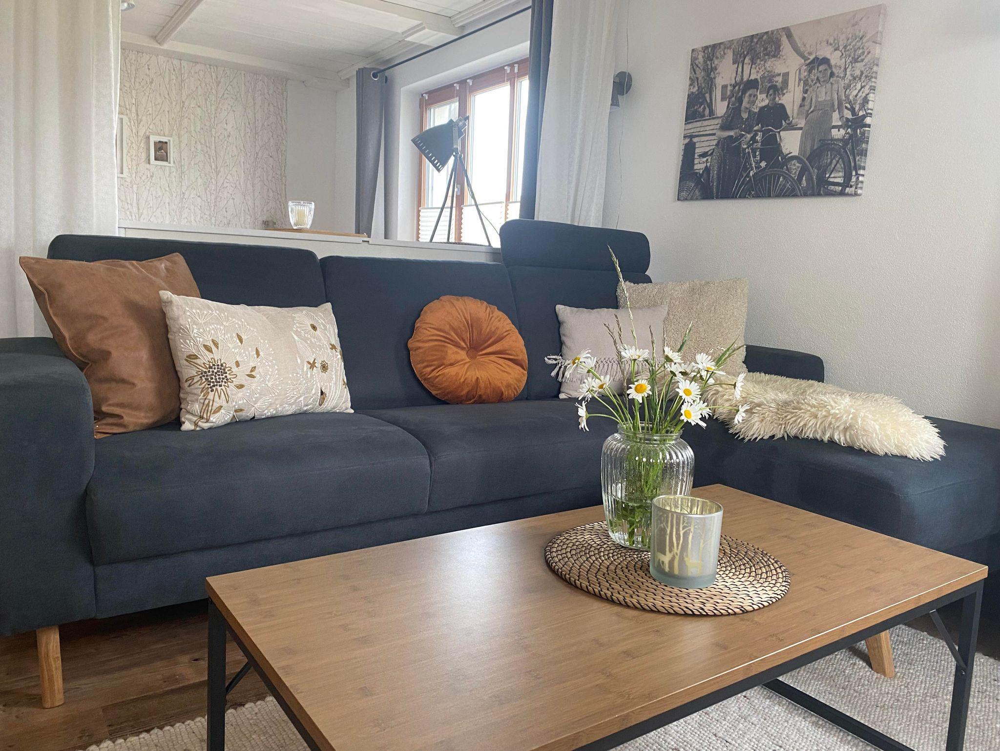 • Wohnzimmer mit neuem Schlaf-Sofa, dieses ist mit einer integrierten Matratze 1,80 x 2 m ausgestattet und mit ein paar leichten Handgriffen in ein gemütliches Bett zu verwandeln.