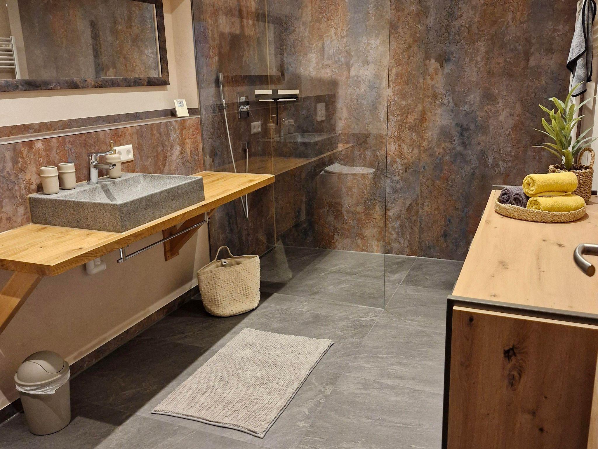• Bad mit begehbarer Dusche, WC, Föhn