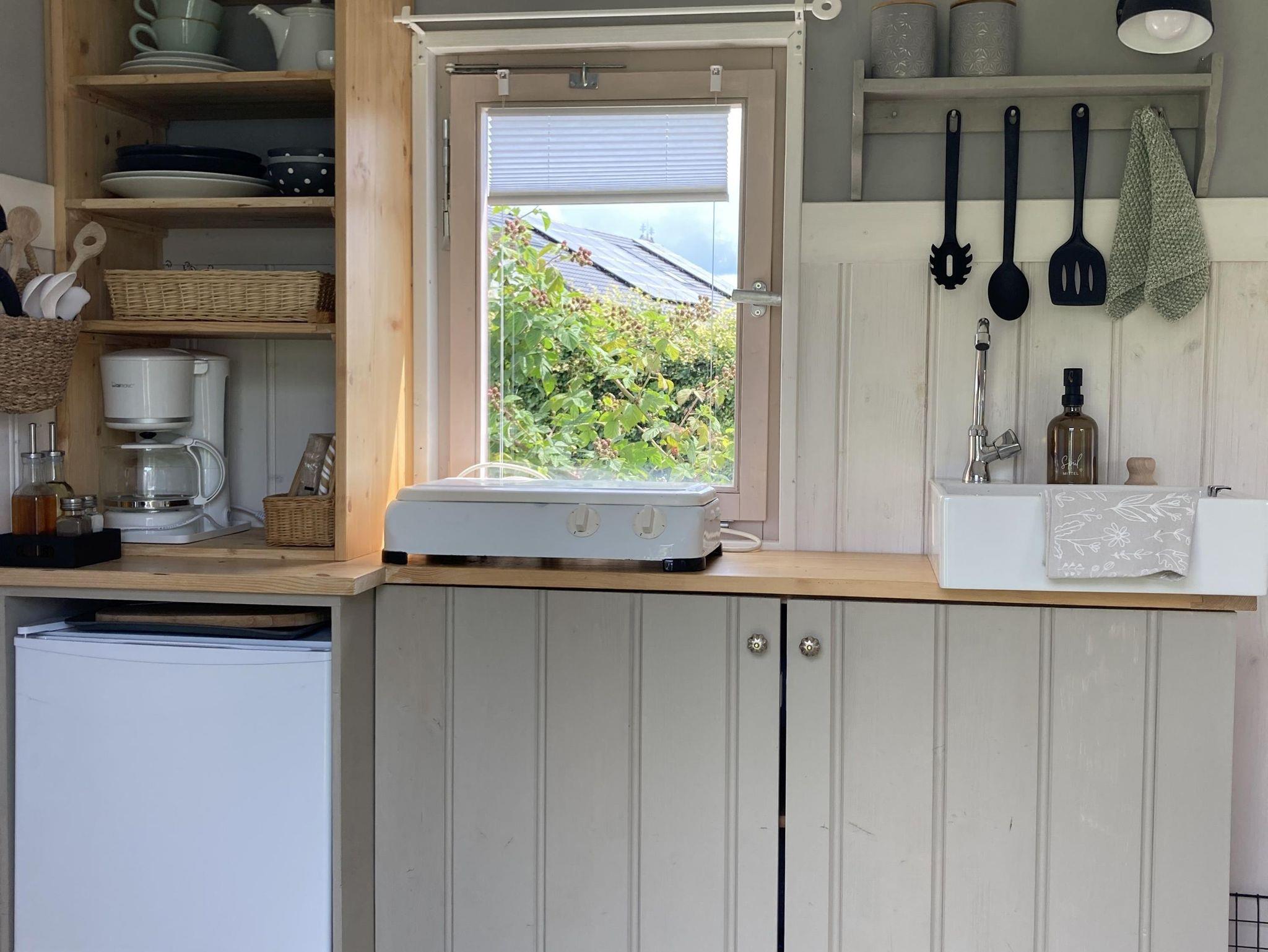 • Kleine Küchenzeile mit Geschirr für 2 Personen, Spülbecken, Kaffeemaschine, Wasserkocher und Kochmöglichkeit