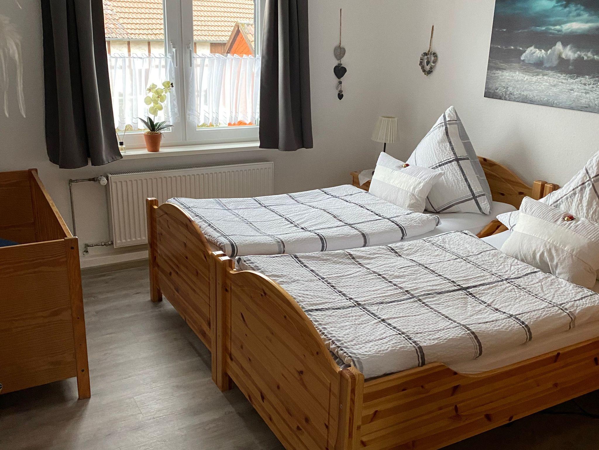Schlafzimmer 1 hat zwei Betten und ein Babybett. Größe der Betten 1 m x 2 m.