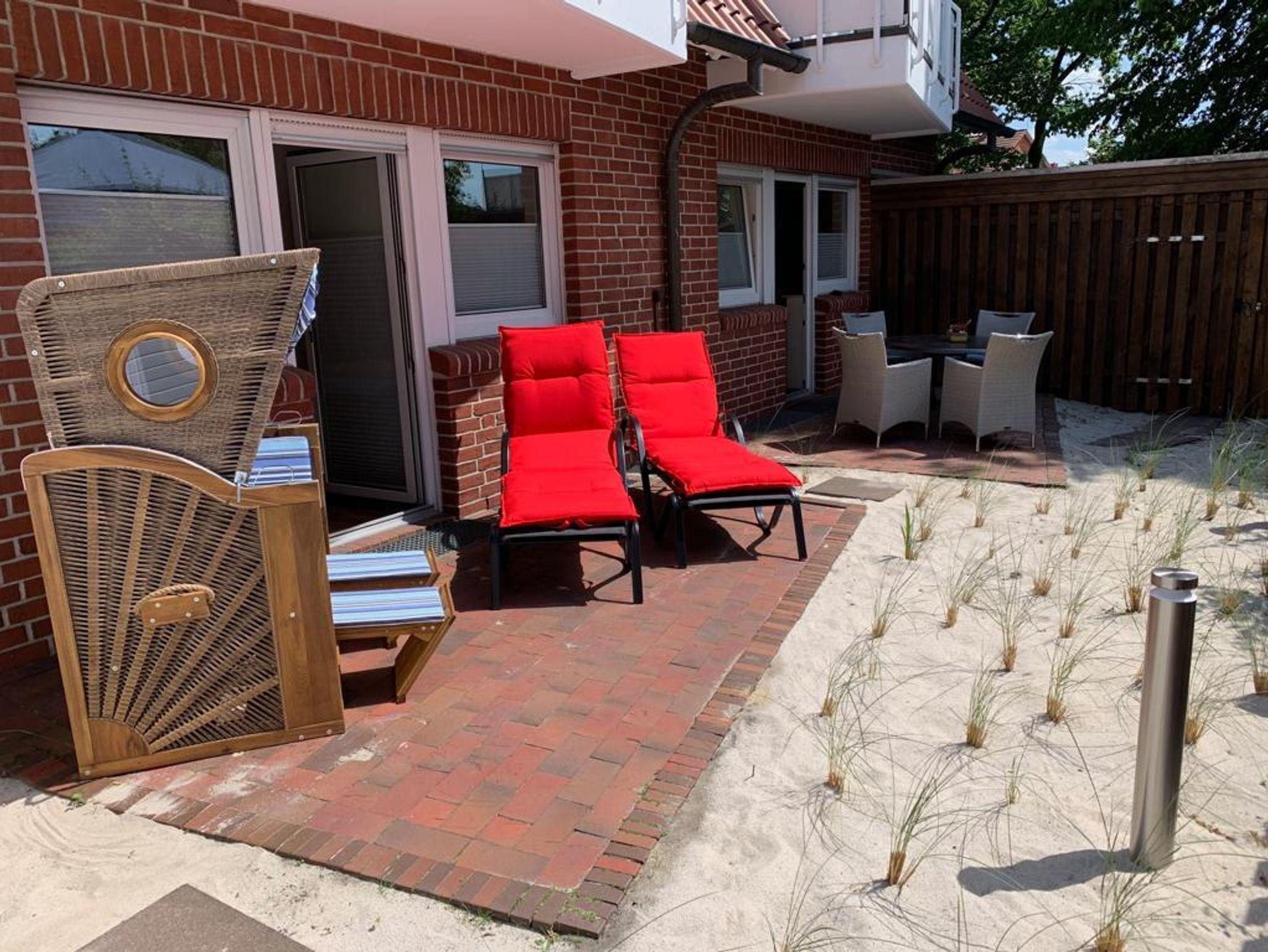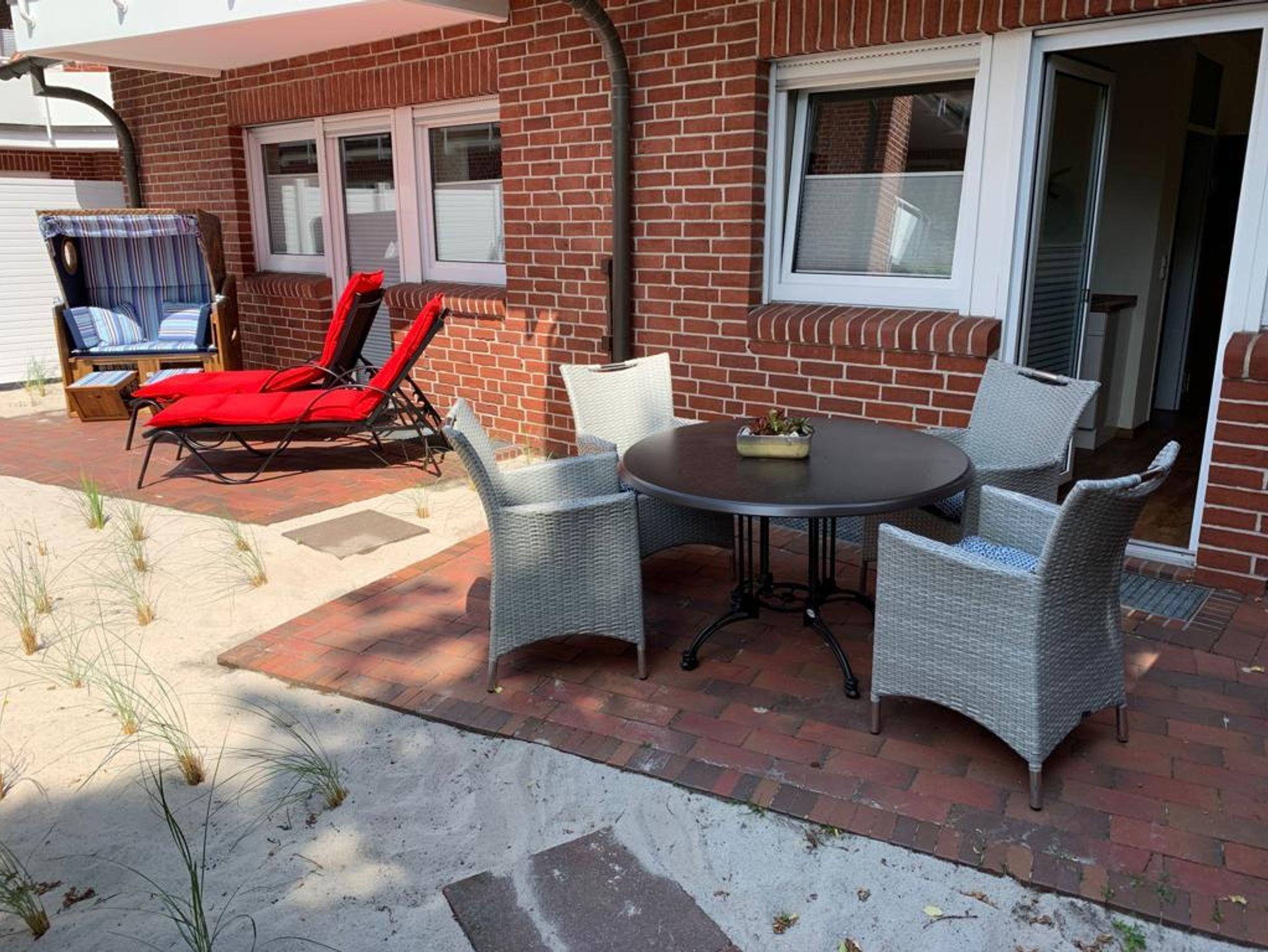 Eine große Terrasse, zur absoluten Sonnenseite, ausgestattet mit Liegestühlen, Strandkorb und Sitzecke, lädt zur Entspannung ein.