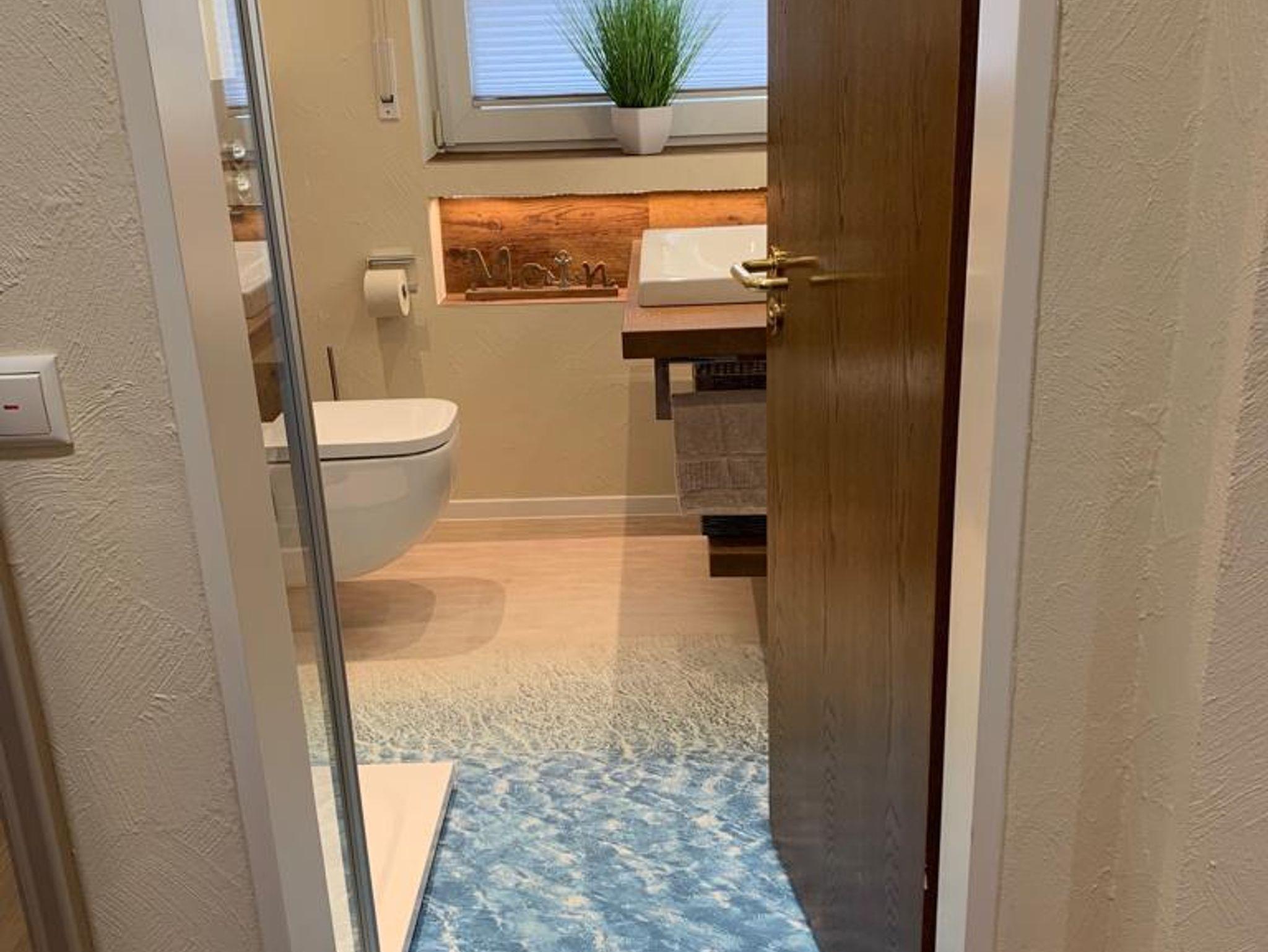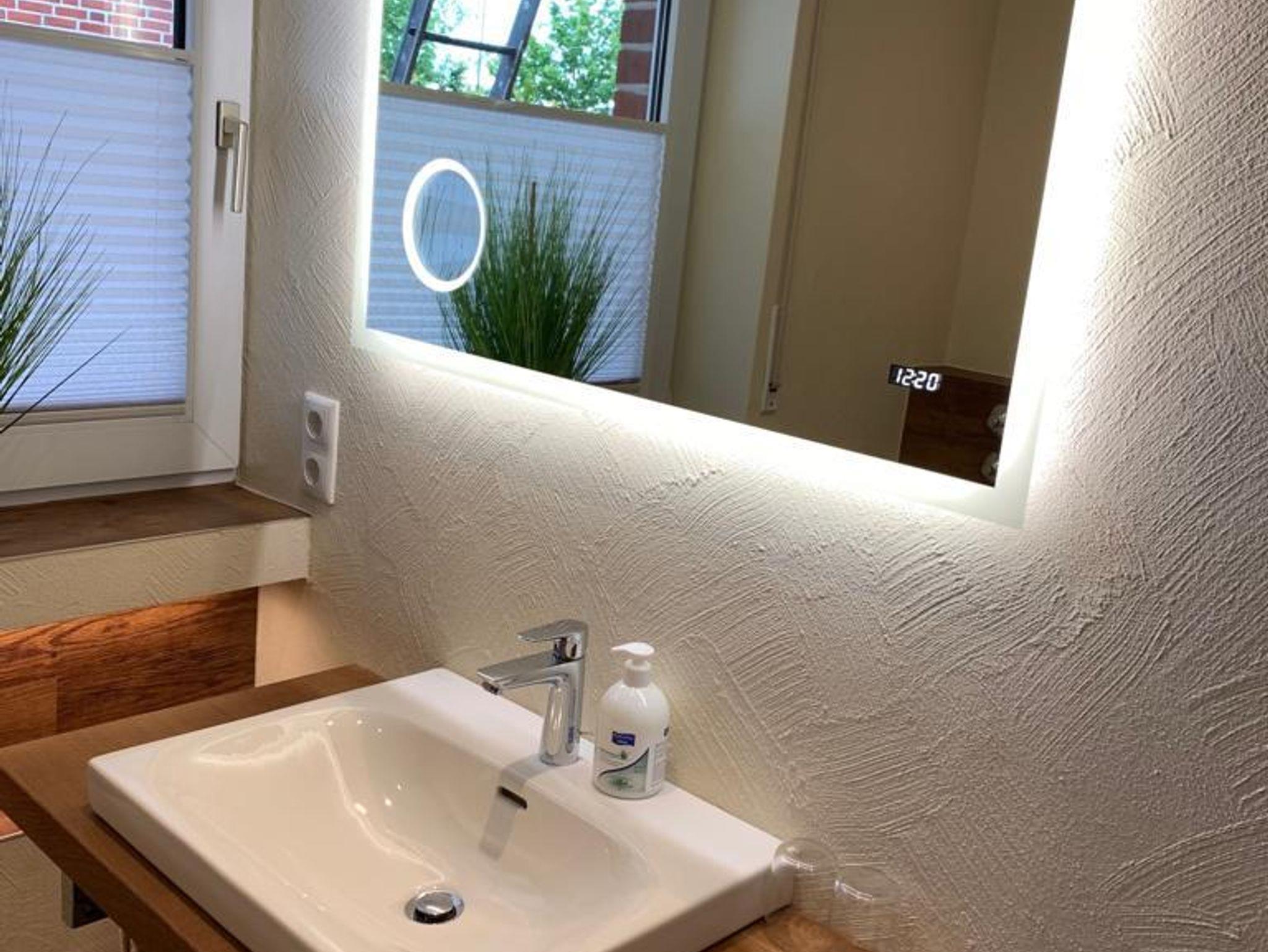 Morgens ein gemütliches Frühstück, Mittags ein kleiner Salat von Ihnen zubereitet in der komplett ausgestatteten Küche und Abends vielleicht ein entspanntes Abendessen in unserem Restaurant „Der Ahrenshof“ 350m entfernt (bitte unbedingt reservieren Tel: 04403-4711). Später lassen sie den Abend bei einem Glas Wein in Ihrer gemütlichen Sofaecke ausklingen. Unsere exklusiven Boxspringbetten garantieren Ihnen danach einen erholsamen Schlaf. Hat sie das Badezimmer überrascht?