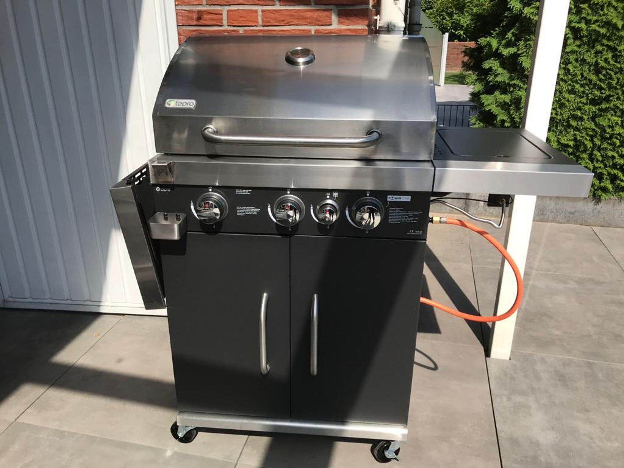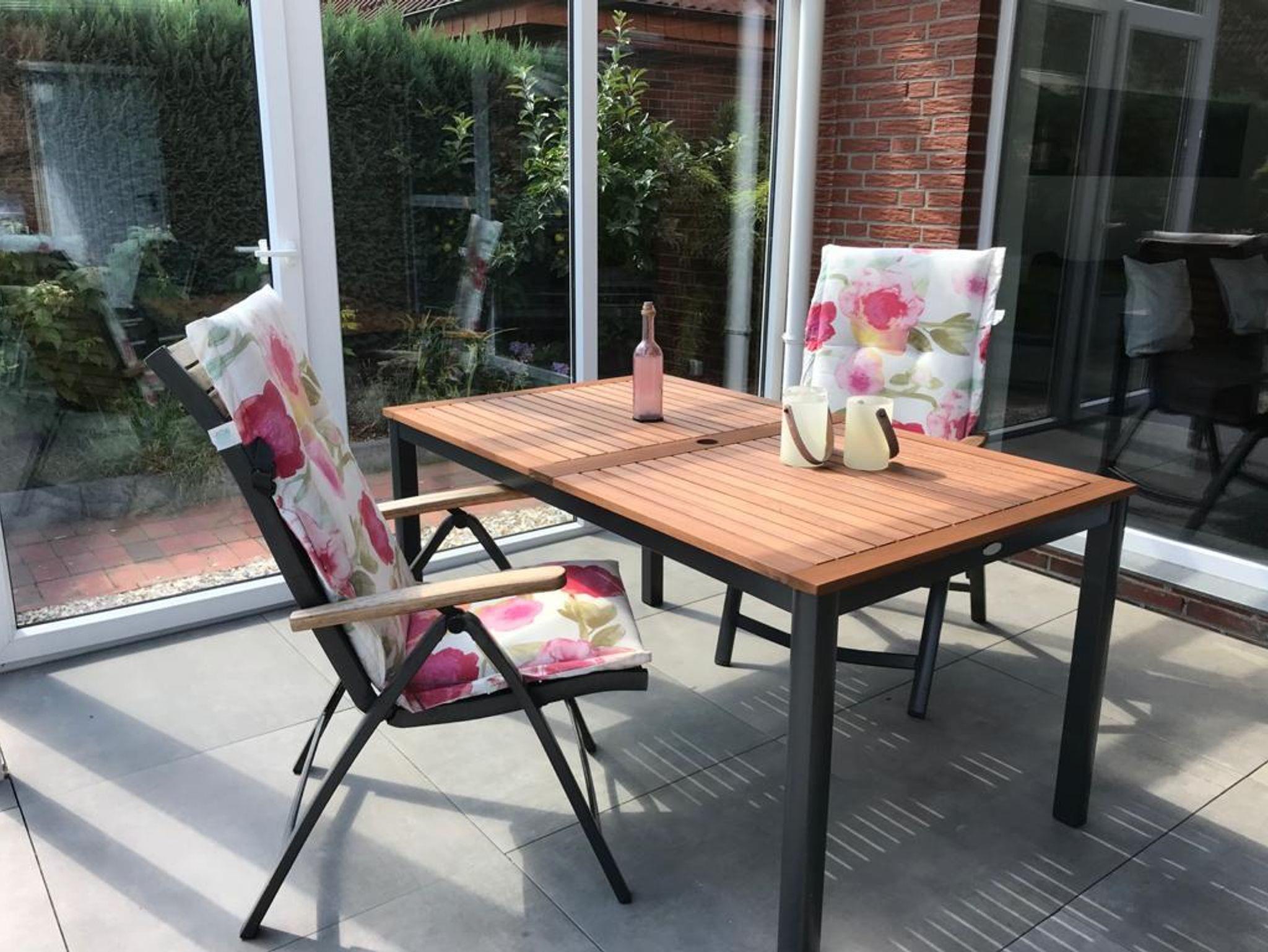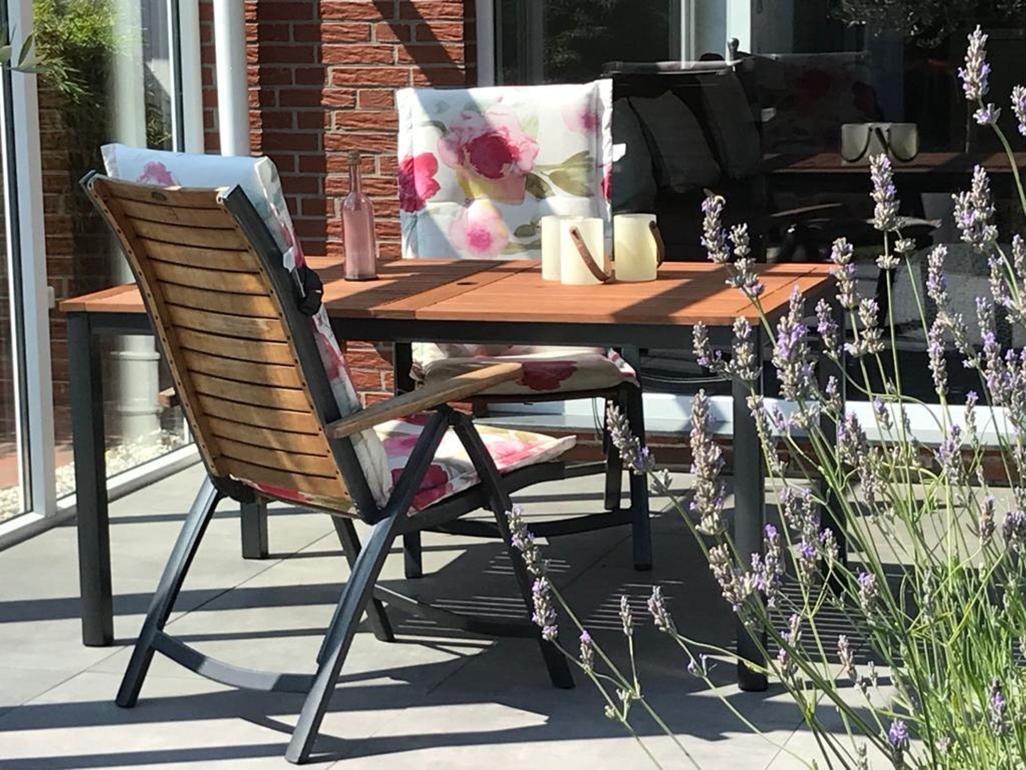 Die Sonnenterrasse ist bestückt mit Gartenmöbeln und Gasgrill.
