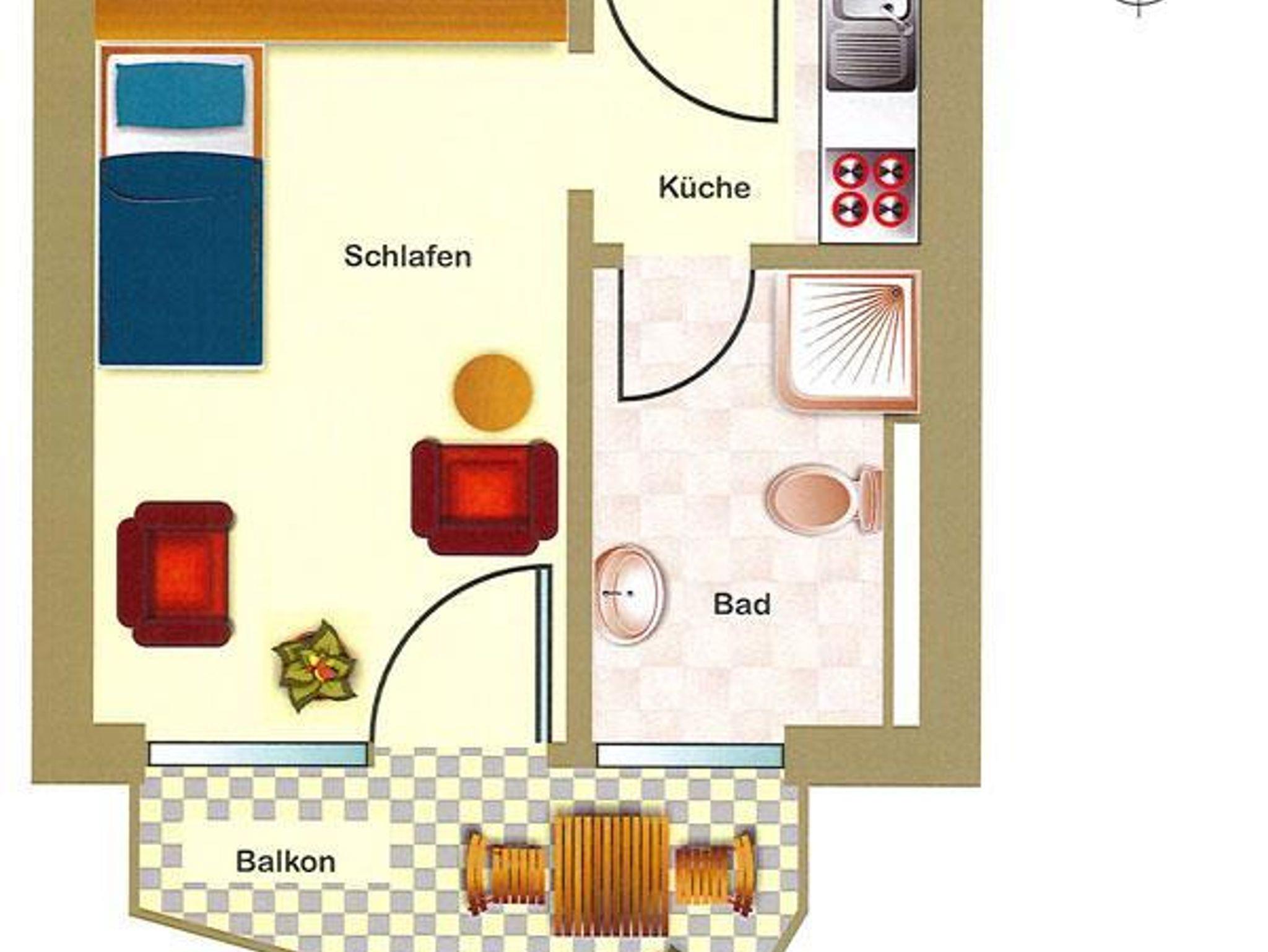 „Klein Wangerooge” 15 qm, 1. Etage, Wohn-Schlafzimmer, Kochnische, Dusche/WC, Balkon. Belegung 1 Person. Separat oder zubuchbar zu Baltrum oder Wangerooge als zweite Schlafgelegenheit