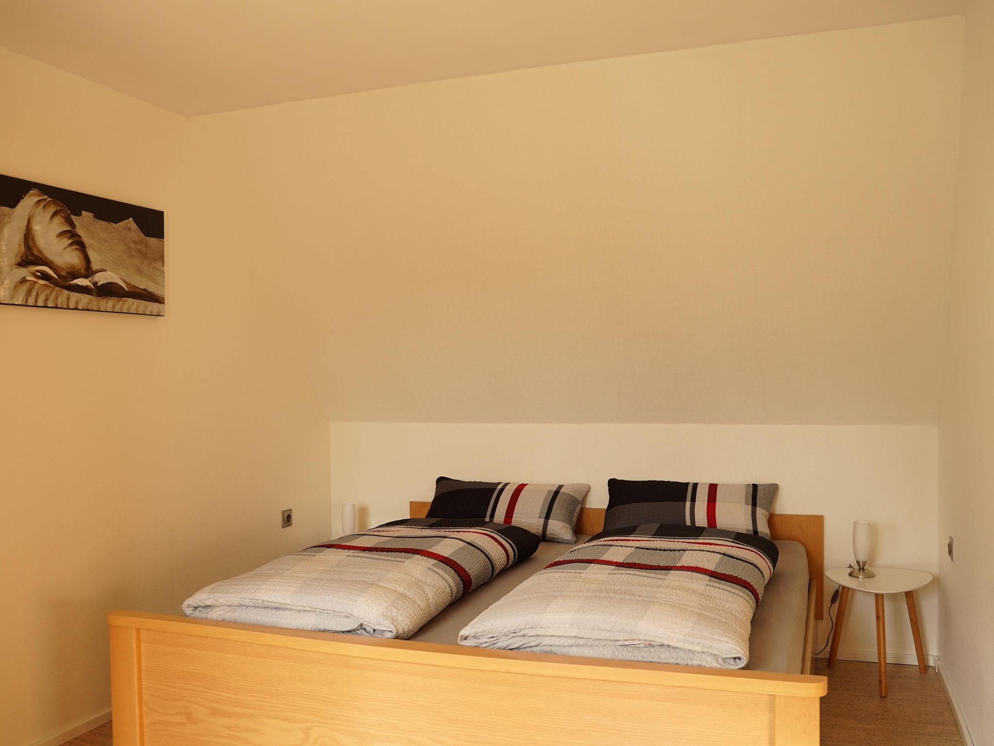 Ein Schlafzimmer ist mit einem Doppelbett, das andere mit zwei Einzelbetten möbliert.