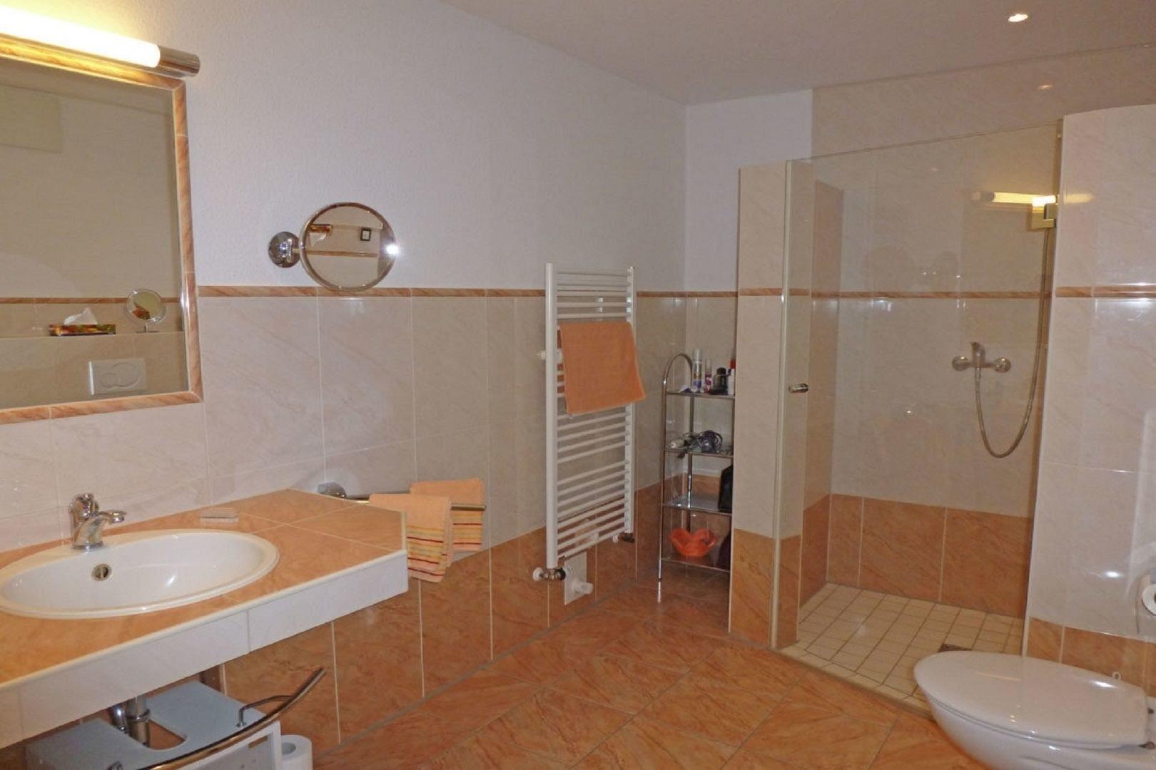 Auch vom separaten Schlafzimmer, mit Kleiderschrank und Fernseher, kann man den Balkon betreten. Das Bett ist 180 x 200 cm groß. Das Duschbad ist mit einer ebenerdigen Dusche ausgestattet. Das Waschbecken kann unterfahren werden.