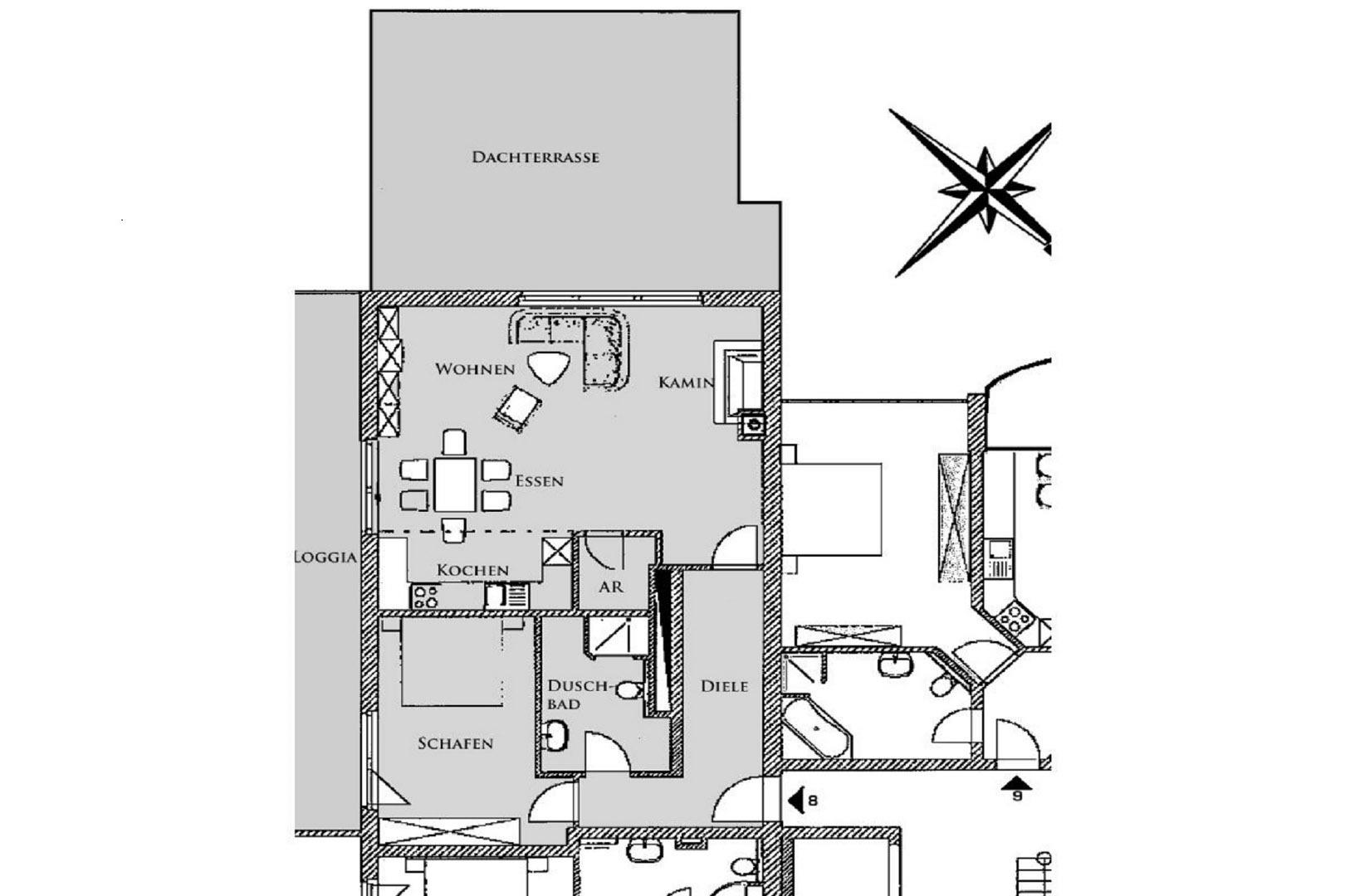 Der großzügig geschnittene Wohnbereich der 90 m² Wohnung wurde Anfang 2021 neu renoviert. Vom Kaminbereich gelangt man auf die großzügige und sonnige Dachterrasse.