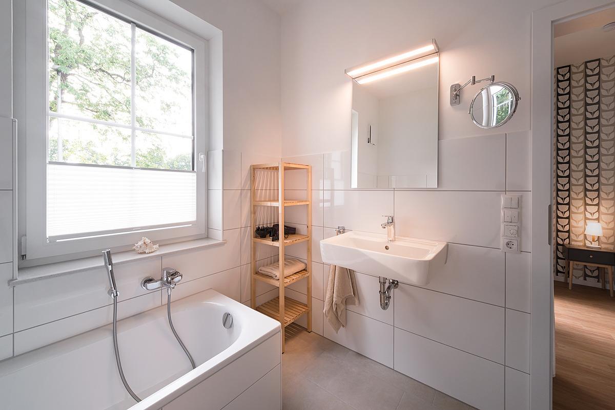 Das Badezimmer mit Fenster lädt Sie zu einem ausgiebigen Schaumbad in der Wanne ein und bietet alternativ auch eine separate ebenerdige Dusche. Für Ihren Aufenthalt bieten wir Ihnen frische Bettwäsche, Handtücher, frische Bademäntel und viele weitere Extras kostenfrei.
