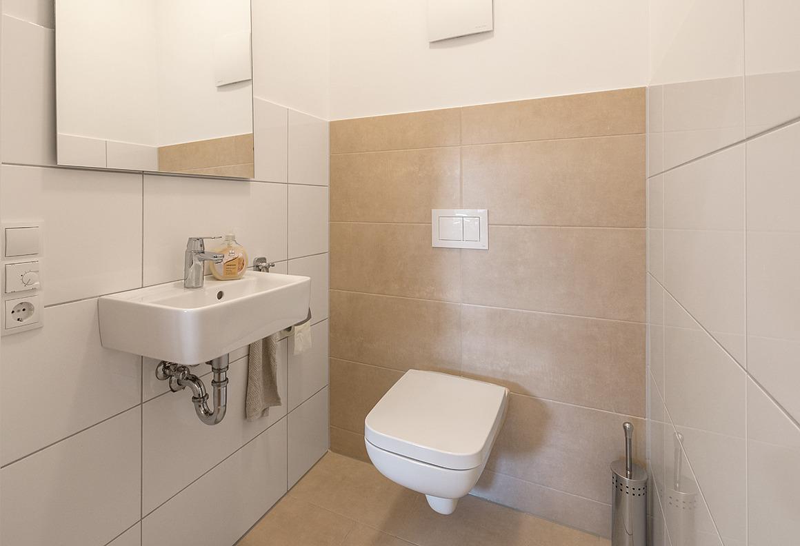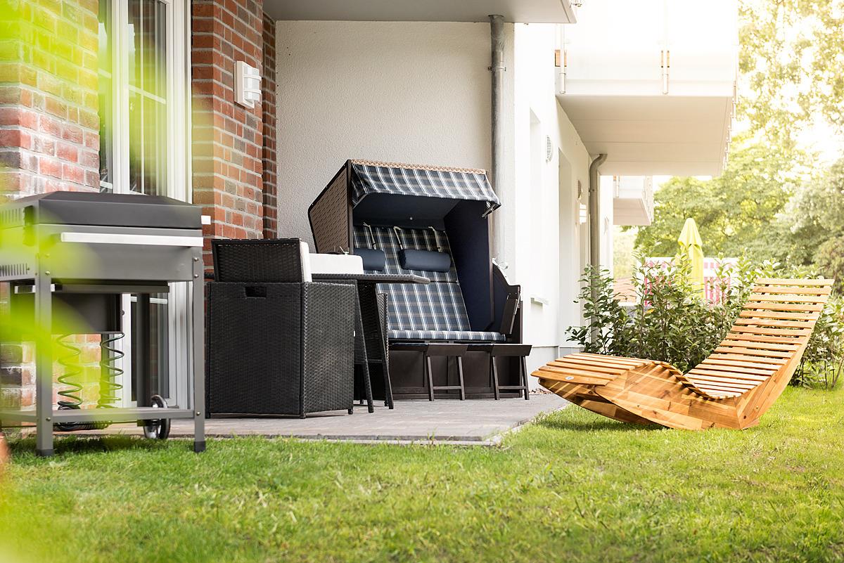 Für ein besonders schönes Ambiente sorgen die edlen Bodenbeläge sowie die Fußbodenheizung im gesamten Wohnraum. Das Schlafzimmer ist mit einem elektrisch verstellbarem Boxspring-Doppelbett ausgestattet und bietet einen direkten Durchgang zur Terrasse.