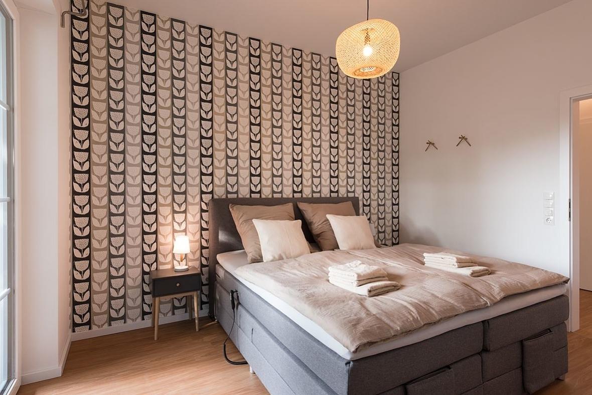 Für ein besonders schönes Ambiente sorgen die edlen Bodenbeläge sowie die Fußbodenheizung im gesamten Wohnraum. Das Schlafzimmer ist mit einem elektrisch verstellbarem Boxspring-Doppelbett ausgestattet und bietet einen direkten Durchgang zur Terrasse.