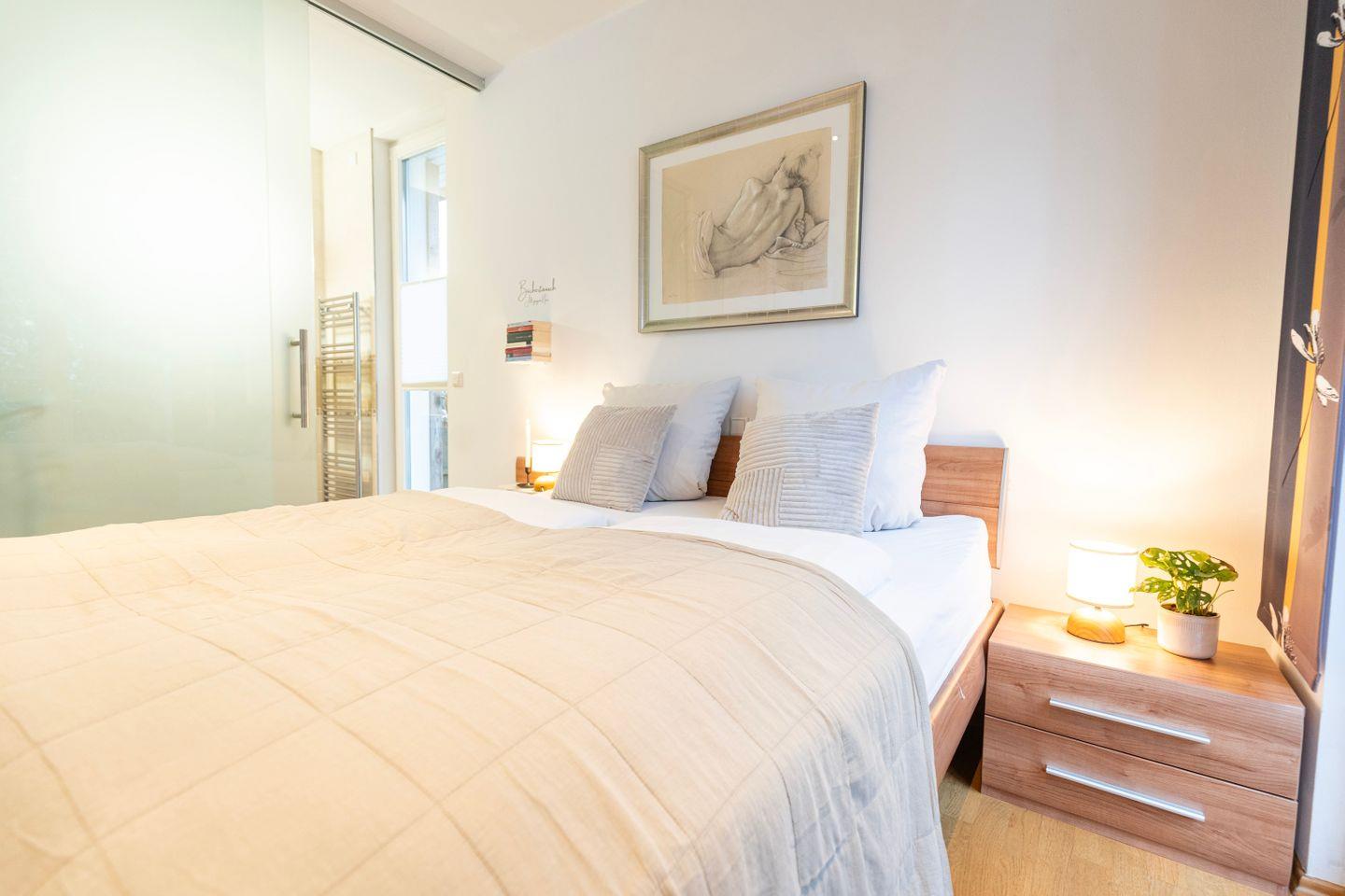Mit dem Auto kannst Du sicher und trocken unsere kostenfreien Carport Stellplätze direkt am Haus nutzen. Dich erwartet ein 61 Quadratmeter großes Apartment mit 1 Schlafzimmern, 1 Bad, Wohnzimmer, Küche und Gäste WC.