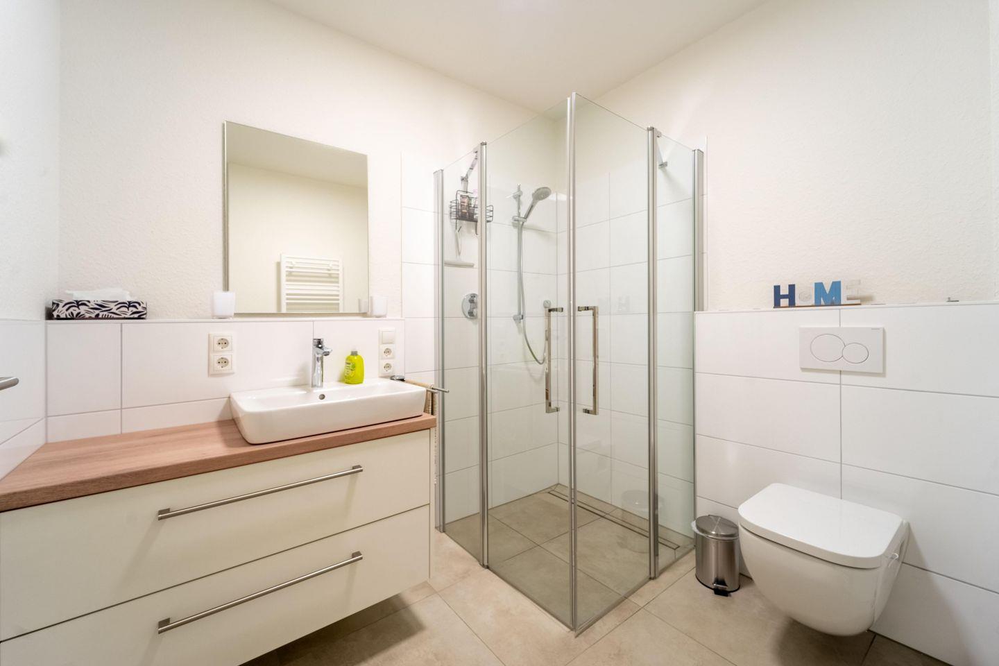 Die Ferienwohnung „Weißer Weg“ bietet auf 81 qm modernen Komfort und viel Platz für bis zu vier Personen. Der offene Wohnbereich mit großer Fensterfront und Zugang zum Balkon ist hell und freundlich gestaltet. Hier befinden sich eine gut ausgestattete Küche mit Ofen, Geschirrspüler, Herd, Kühlschrank und Gefrierschrank, ein Essbereich und ein gemütliches Wohnzimmer mit großem Smart TV. Die Wohnung verfügt über zwei Schlafzimmer – eines mit einem komfortablen Doppelbett und das andere mit zwei Einzelbetten – sowie ein modernes Badezimmer mit bodengleicher Dusche.