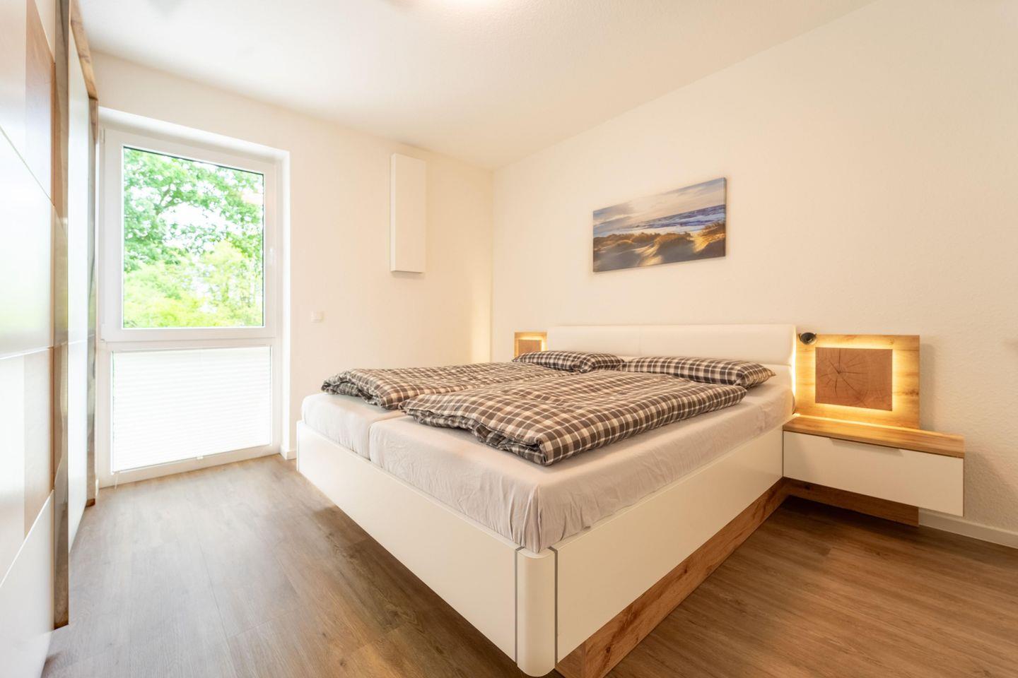 Die Ferienwohnung „Weißer Weg“ bietet auf 81 qm modernen Komfort für bis zu vier Personen. Der offene Wohnbereich mit Balkonzugang, große Fensterfront, gut ausgestatteter Küche, Essbereich und Wohnzimmer mit Smart TV ist hell und freundlich. Zwei Schlafzimmer und ein modernes Badezimmer mit bodengleicher Dusche runden das Angebot ab. Highlights sind der windgeschützte Balkon, ein Kabuff für Fahrräder und kostenfreie SUP-Boards.