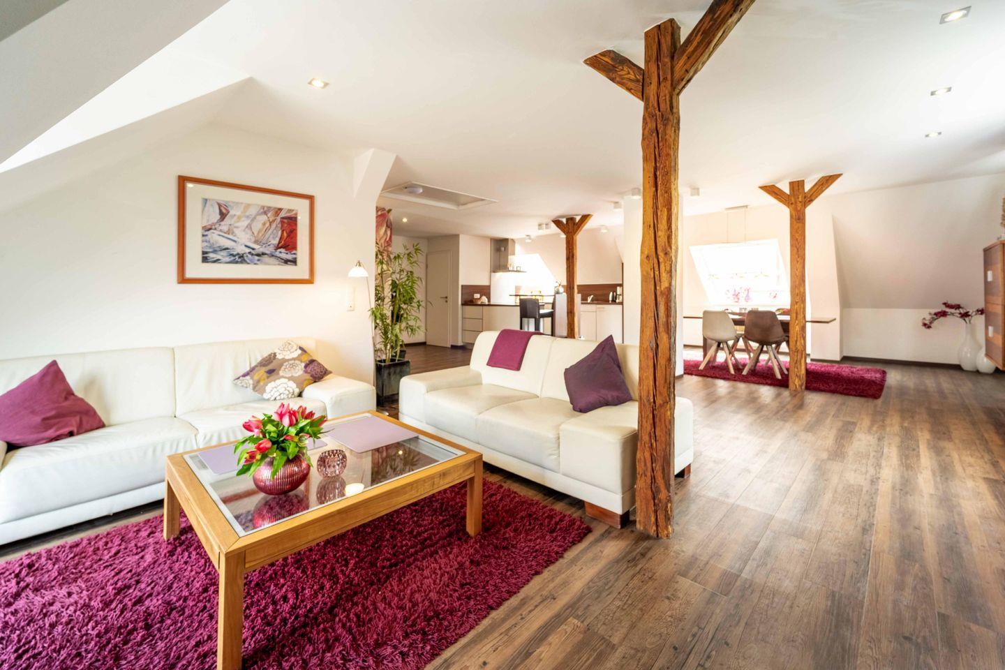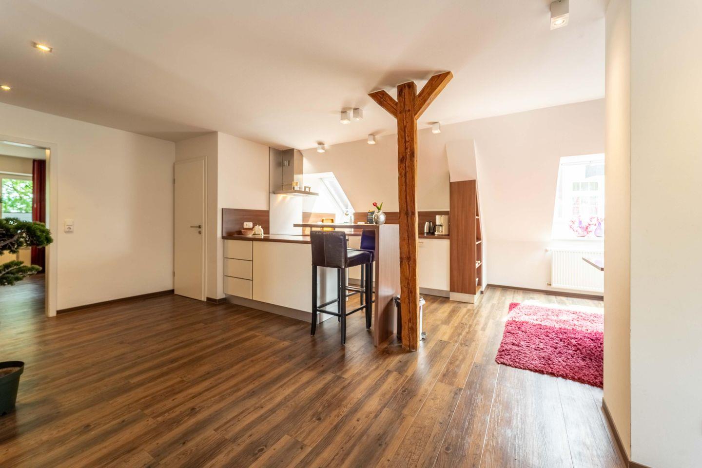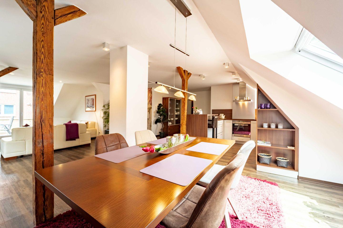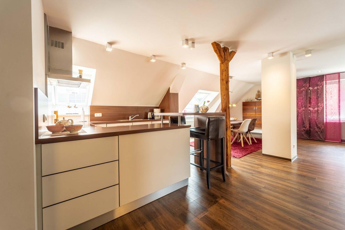 Das Herzstück der Wohnung ist das helle und großzügige Wohn- und Esszimmer mit offener, moderner Küche. Hier kannst Du gemütliche Abende verbringen oder einfach nur die entspannte Atmosphäre genießen. Die gut ausgestattete Küche bietet Dir alles, was Du zum Kochen benötigst.
