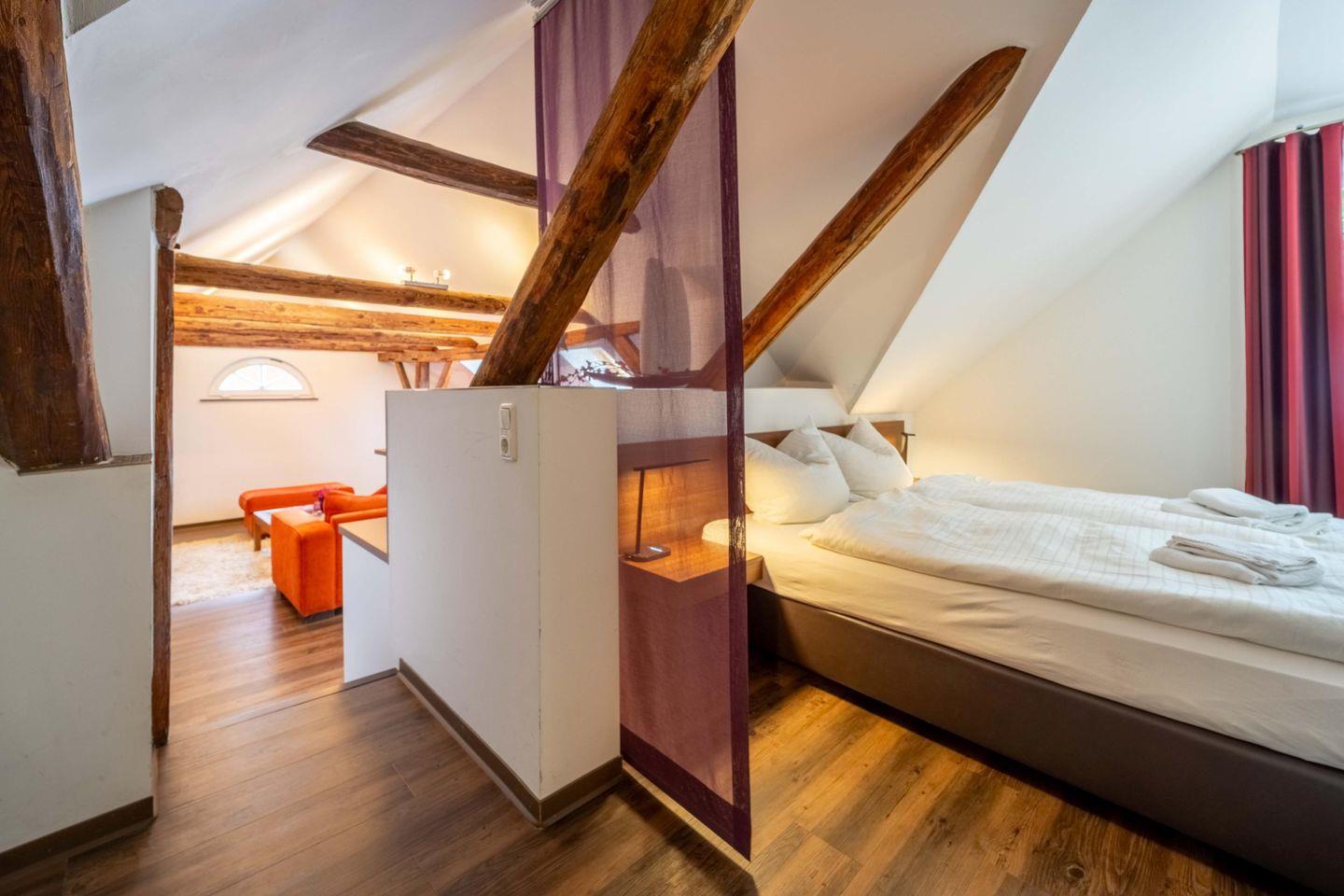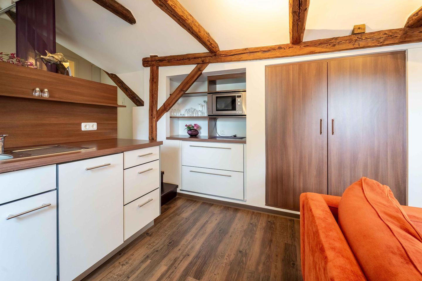 Diese gemütliche 1-Zimmer-Wohnung „Petit Superior“ bietet alles, was Du für einen unvergesslichen Aufenthalt benötigst. Der komplett offene Bereich erstreckt sich über zwei Ebenen, verbunden durch drei Stufen, und beeindruckt mit offenen Holzbalken, die der Wohnung einen besonderen Charme verleihen. Der großzügige Sitzbereich mit Sofa und Sessel lädt zum Entspannen ein, während die offene Küchenzeile alles bietet, was Du zum Kochen benötigst. Der Schlafbereich ist für zwei Personen ausgelegt und das moderne Badezimmer verfügt über eine bodengleiche Dusche.