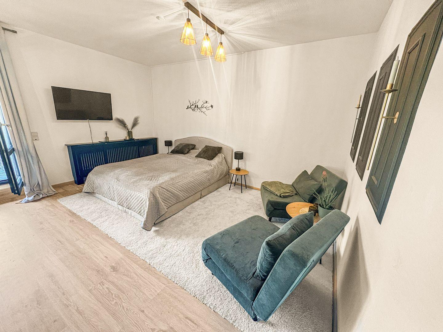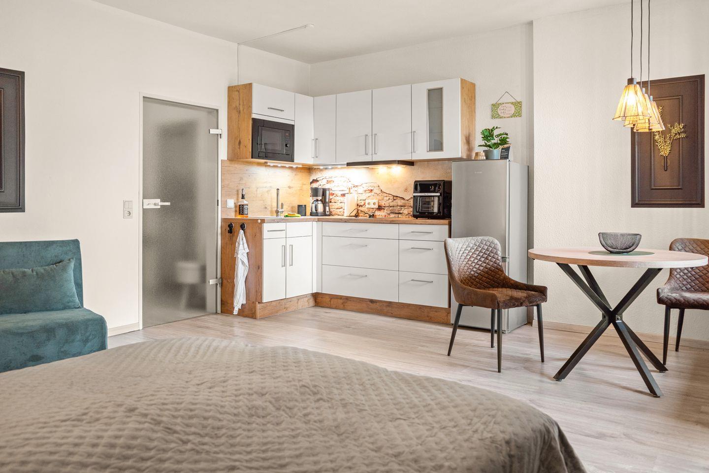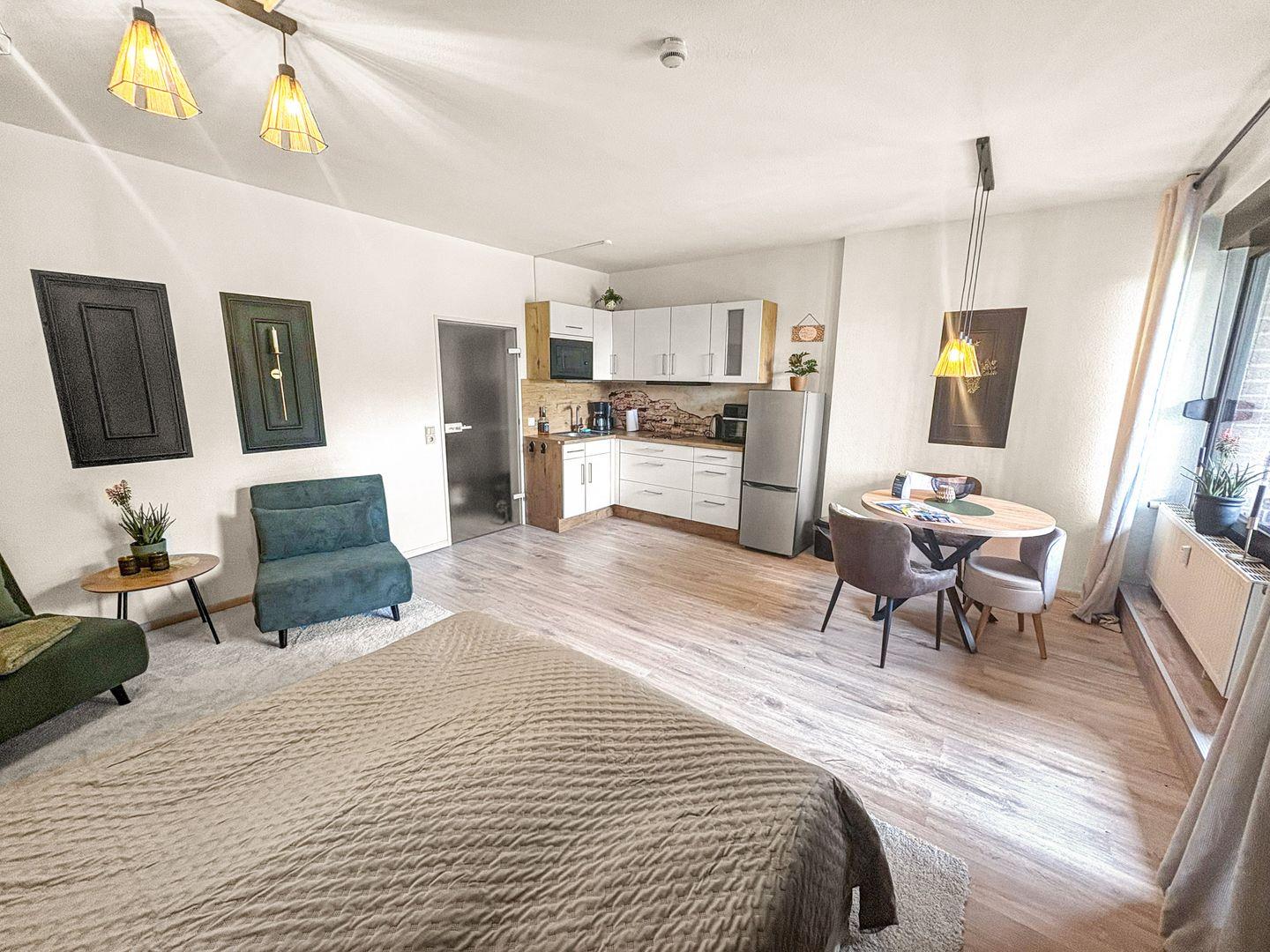 Das bequeme Bett sorgt für erholsame Nächte, während zwei große Sessel, die sich in zusätzliche Schlafmöglichkeiten verwandeln lassen, für Flexibilität sorgen. Die offene Küchenzeile ist modern und voll ausgestattet – perfekt, um sich auch im Urlaub selbst zu versorgen.
