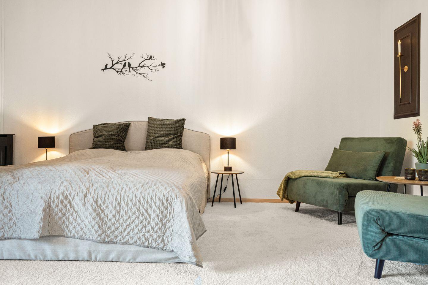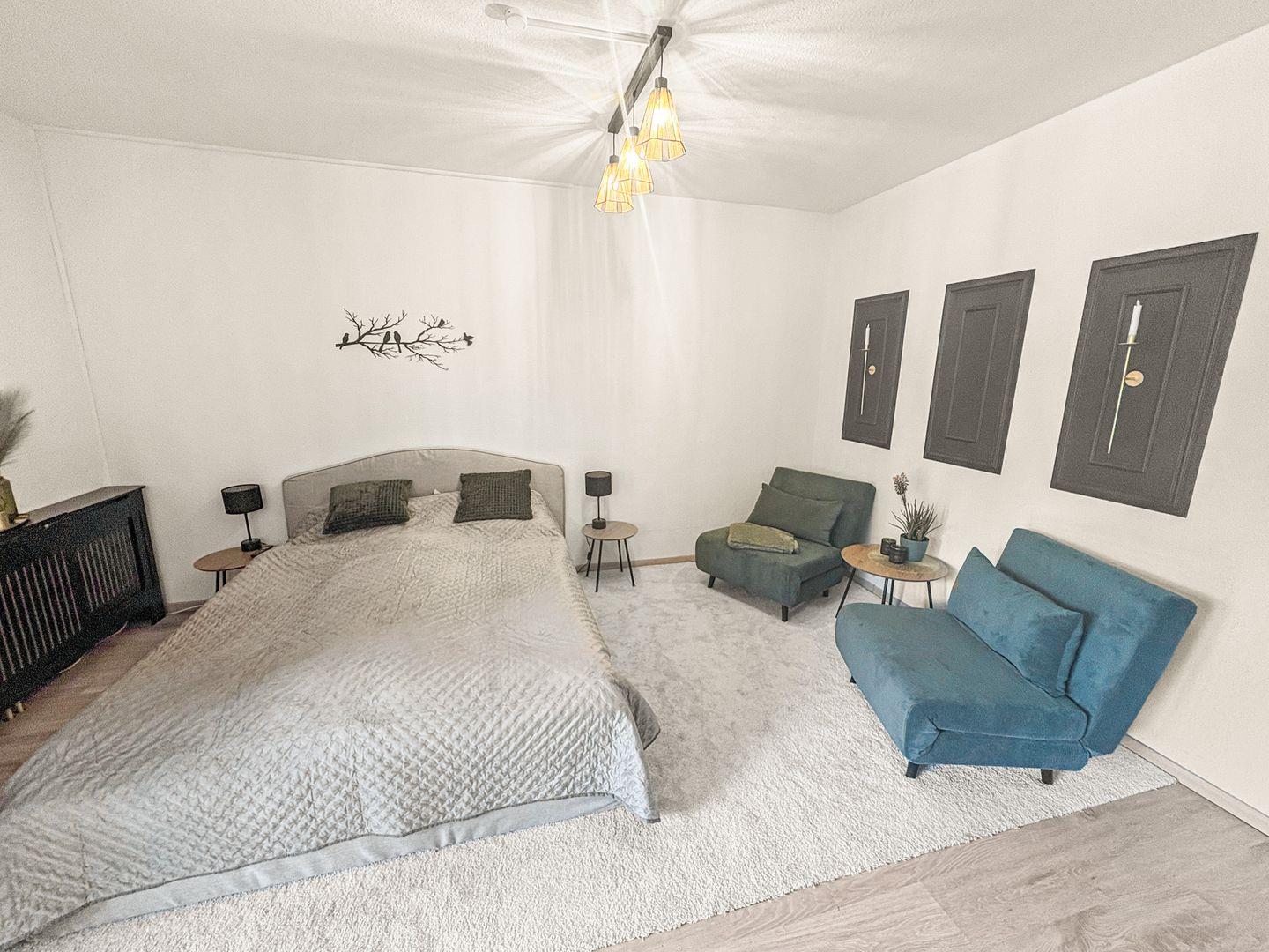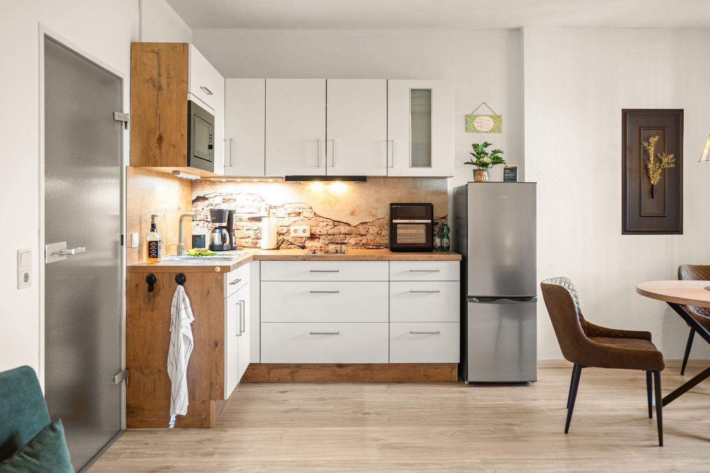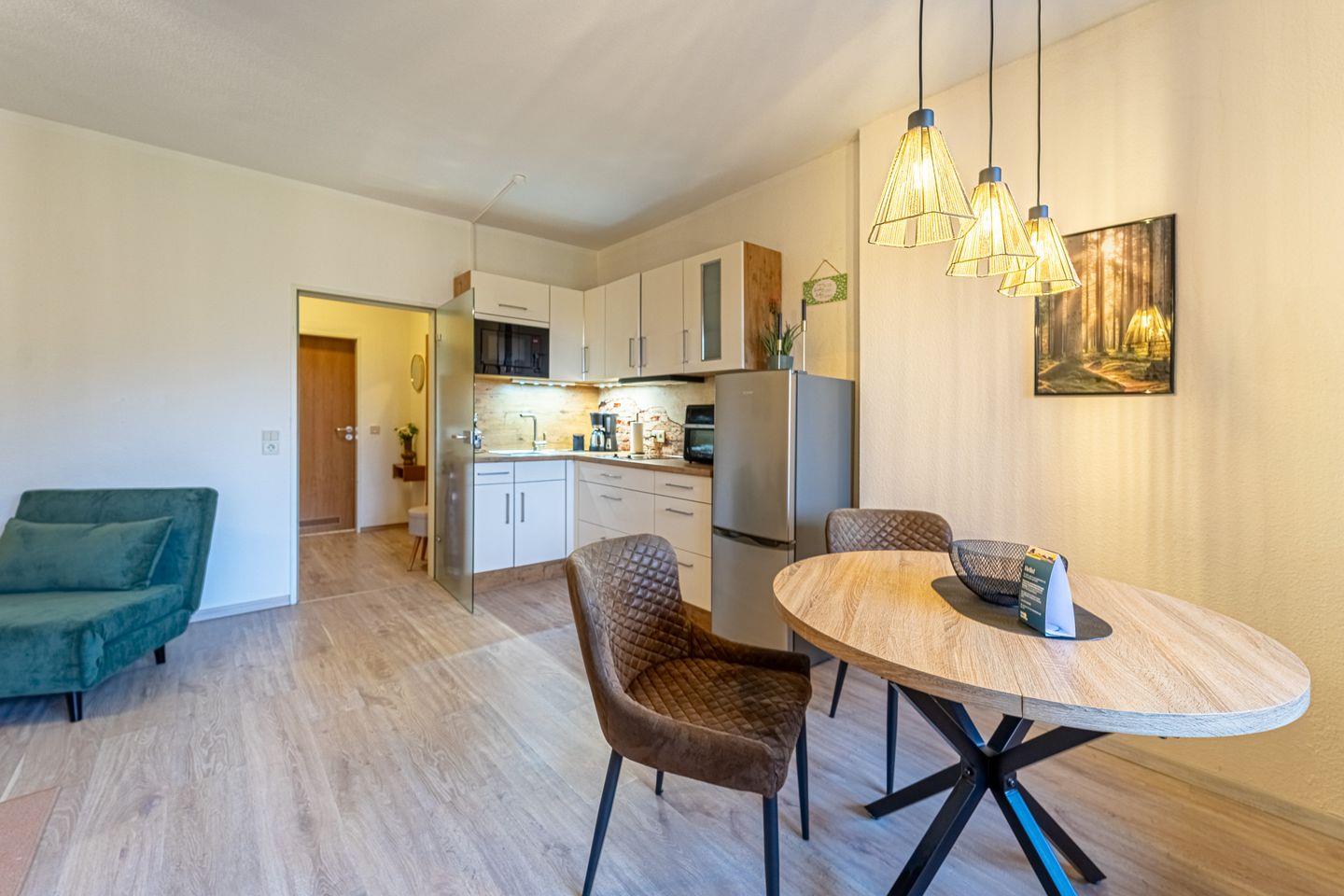 Das bequeme Bett sorgt für erholsame Nächte, während zwei große Sessel, die sich in zusätzliche Schlafmöglichkeiten verwandeln lassen, für Flexibilität sorgen. Die offene Küchenzeile ist modern und voll ausgestattet – perfekt, um sich auch im Urlaub selbst zu versorgen.