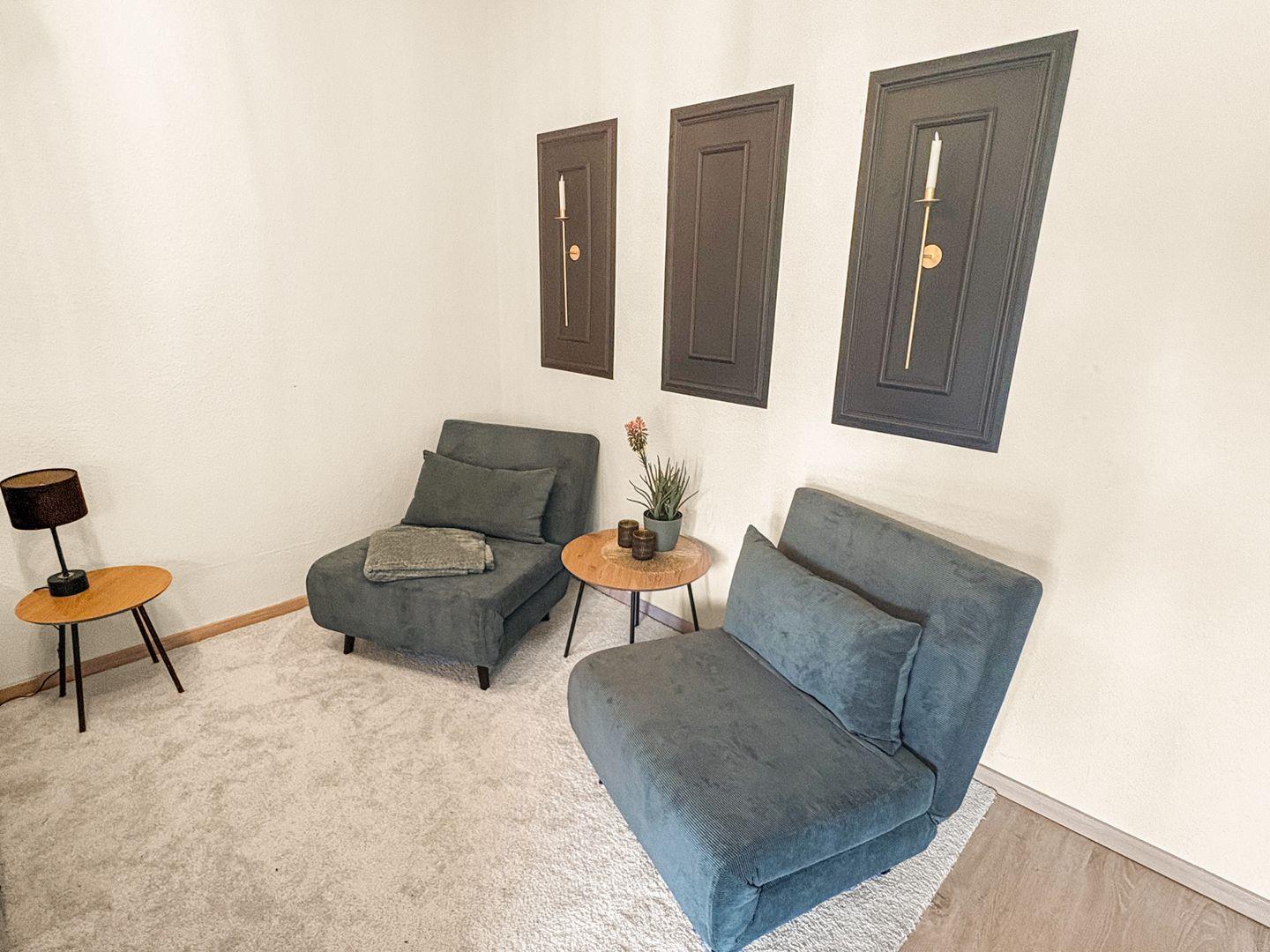 Beachtet bitte, dass bei 4 Personen die beiden Sessel im Wohnzimmer in Schlafgelegenheiten gewandelt werden. Sie können auch als Doppelbett gestellt werden. Maße eines Sessels: 77x200cm.