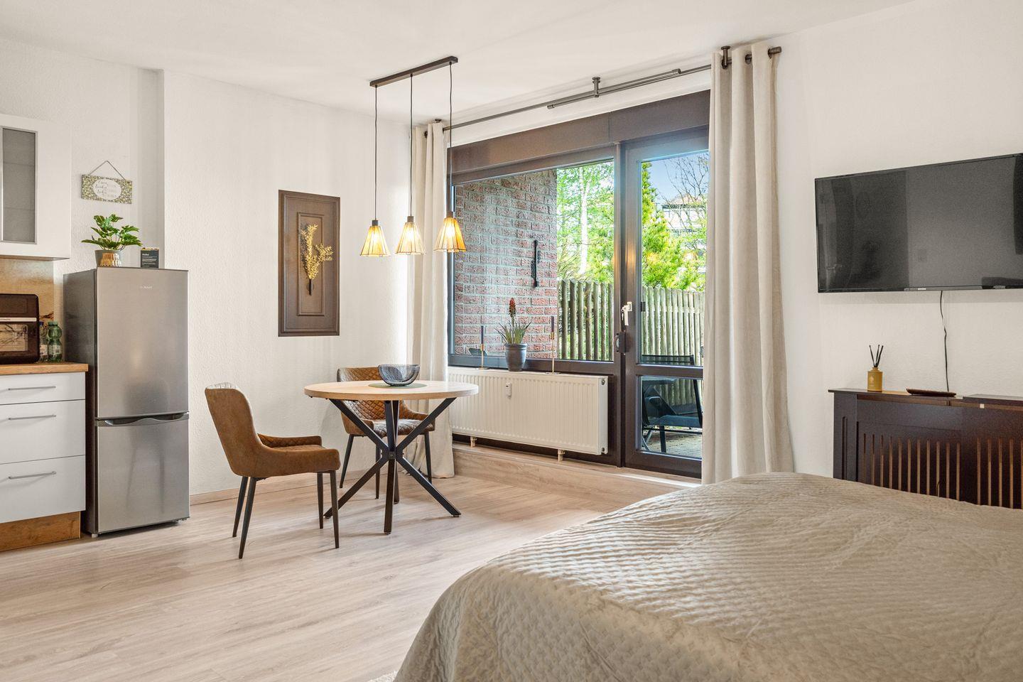 Das Einzimmer-Apartment kombiniert Wohnen, Schlafen und Kochen in einem offenen Raum. Eine große Fensterfront sorgt für viel Licht und gewährt einen wunderschönen Blick auf den Yachthafen. Von hier aus gelangst du auch direkt auf die 20 qm große Terrasse, die zum Entspannen einlädt.
