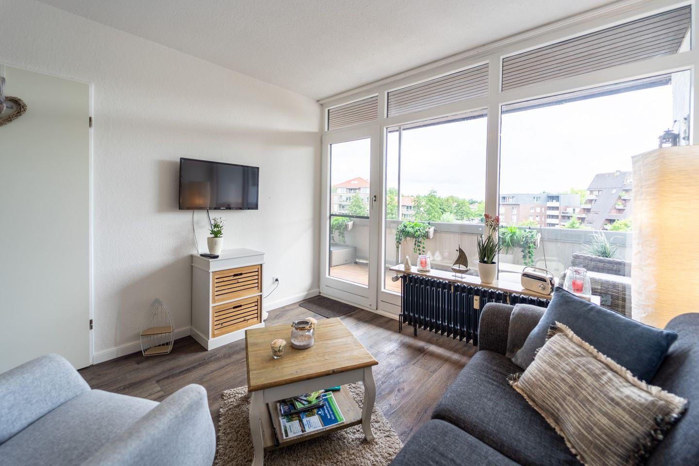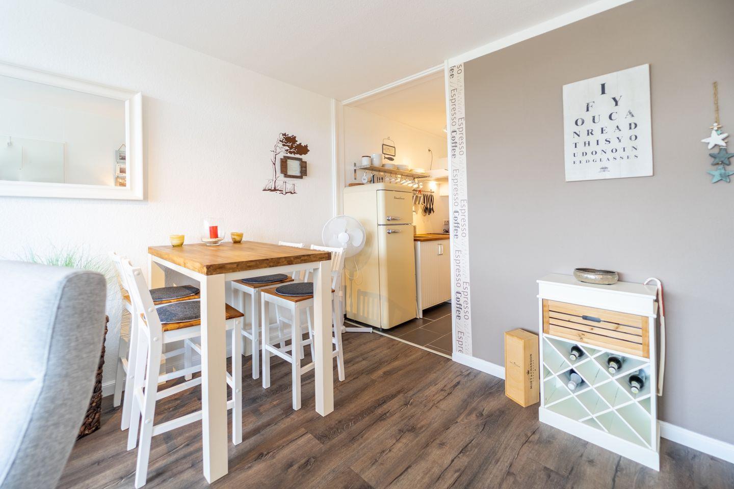 Die helle Wohnung befindet sich in der 4. Etage. Sie überzeugt mit geschmackvoller Einrichtung und einem schönen Blick über den Hafen. Das Herzstück ist der offene Wohn- und Essbereich mit angrenzendem, sonnigen Süd-Balkon und einzigartigem Blick auf den Yachthafen. Mit Couch (Schlafsofa), Esstisch und TV ist er der perfekte Ort zum Entspannen nach einem Tag am Wasser.