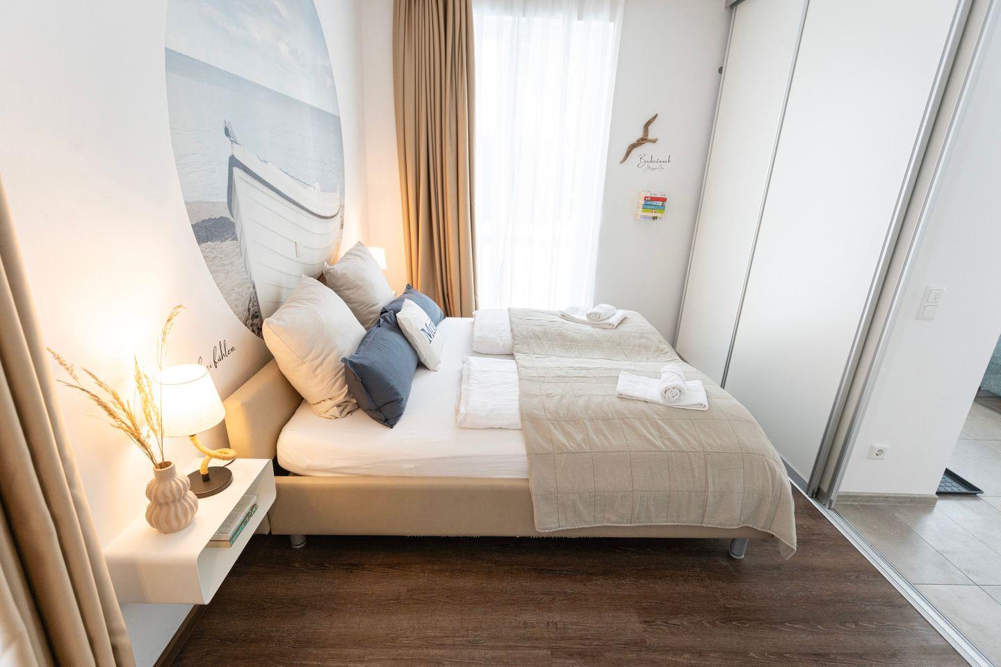 Beginne Deinen Tag mit leckerem Kaffee und genieße all die Annehmlichkeiten dieses Apartments, einschließlich der großen Terrasse mit exklusivem Seeblick, großzügigen Sitzbereichen für 4 Personen, einem Grill und Zugang zur Sauna auf der Anlage. Die Wohnung ist inspiriert vom Element Wasser, was sich in einem ruhigen und erfrischenden Interior-Design widerspiegelt.