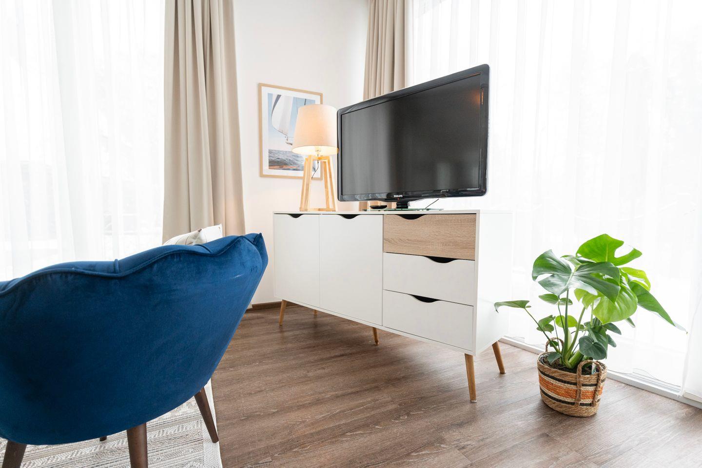 Das Schlafzimmer bietet ein gemütliches 1,80m Doppelbett. Im Wohnzimmer findest Du eine hochwertige Schlafcouch, ideal für Familienbesuche, sowie einen großen Essbereich für 4 Personen und einen bequemen Sitzbereich mit Sofa und TV. Zusätzlich gibt es einen Arbeitsplatz mit Schreibtisch und schnellem Internet, perfekt für produktive Stunden oder als Homeoffice.