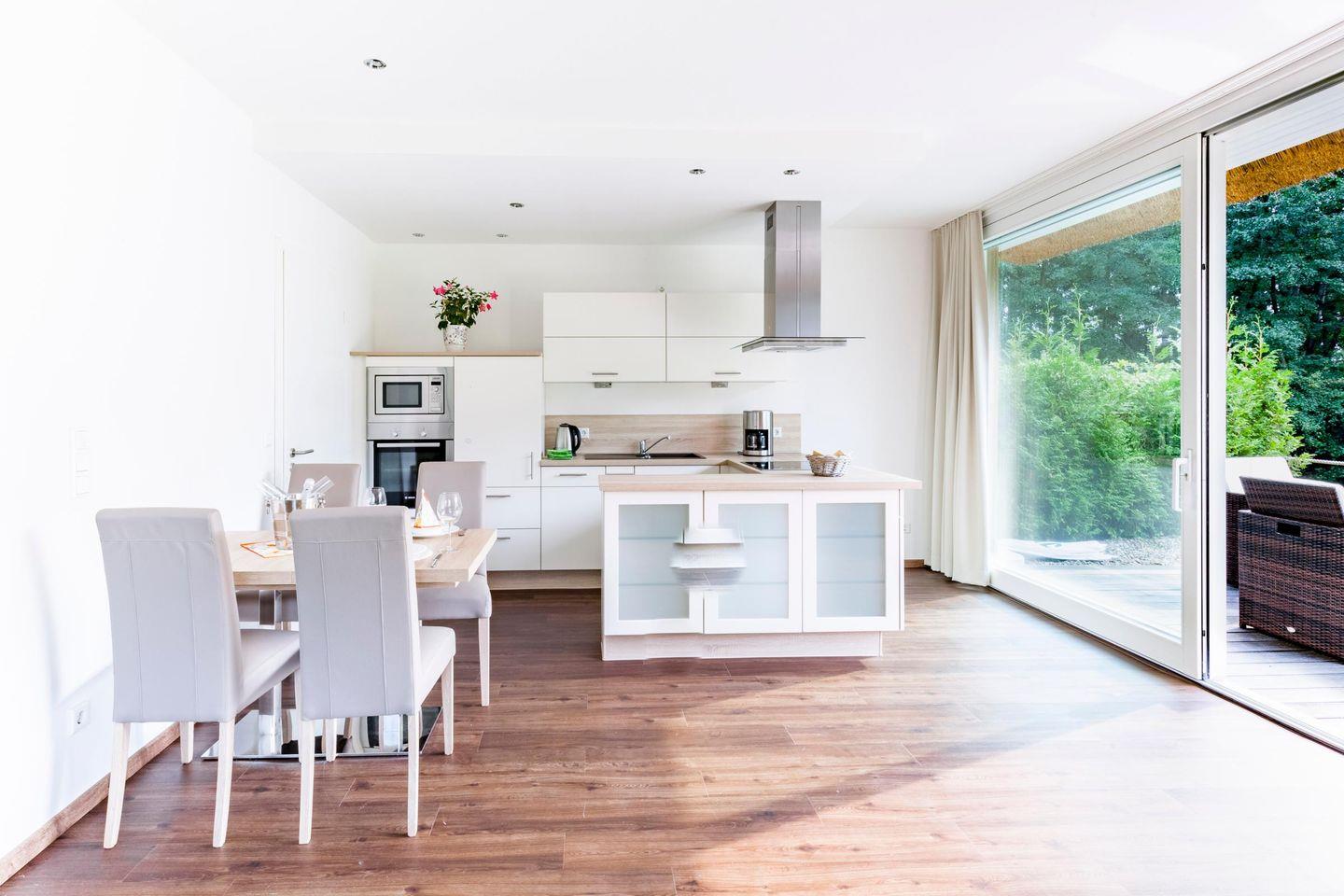 Die Küche ist natürlich voll ausgestattet mit Herd, Kühlschrank, Backofen, Spülmaschine, Mikrowelle und allem was Du sonst brauchst um lecker zu kochen. Das Apartment verfügt ebenso über eine Waschmaschine.