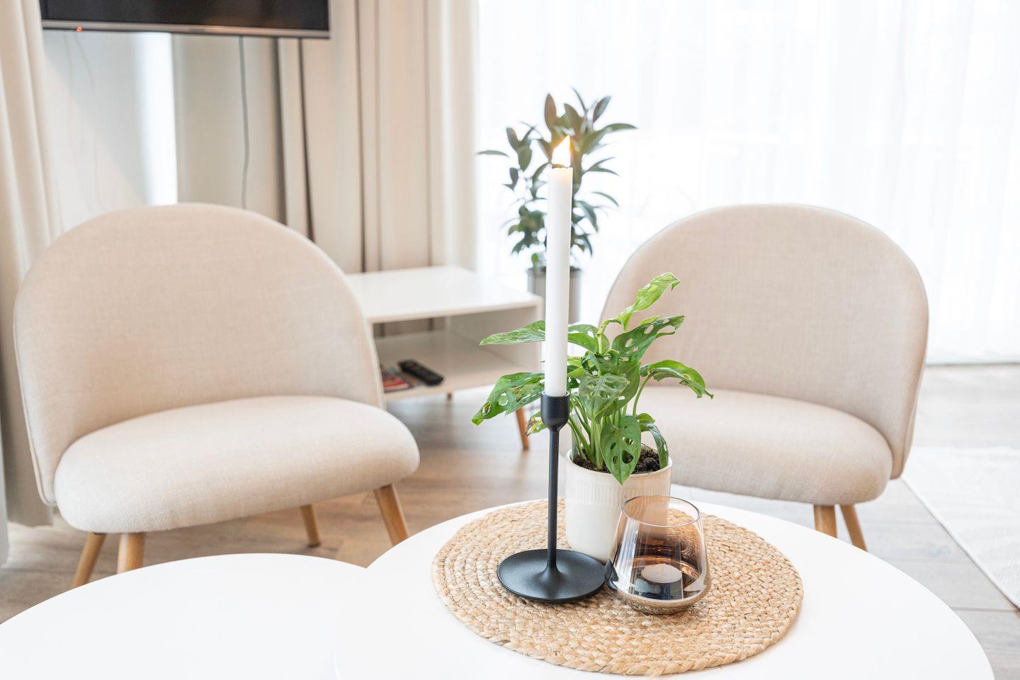 Beginne Deinen Tag mit leckerem Kaffee und genieße all die Annehmlichkeiten dieses Apartments, einschließlich der großen Terrasse mit exklusivem Seeblick, großzügigen Sitzbereichen für 4 Personen, einem Grill und Zugang zur Sauna auf der Anlage. Die Wohnung ist inspiriert vom Element Luft, was sich in einem ruhigen und erfrischenden Interior-Design widerspiegelt.