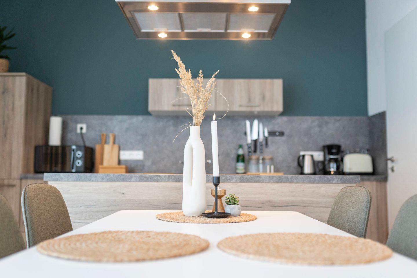 Das Schlafzimmer bietet ein gemütliches 1,80m Doppelbett. Im Wohnzimmer findest Du eine hochwertige Schlafcouch, ideal für Familienbesuche, sowie einen großen Essbereich für 4 Personen und einen bequemen Sitzbereich mit Sofa und TV. Zusätzlich gibt es einen Arbeitsplatz mit Schreibtisch und schnellem Internet, perfekt für produktive Stunden oder als Homeoffice.