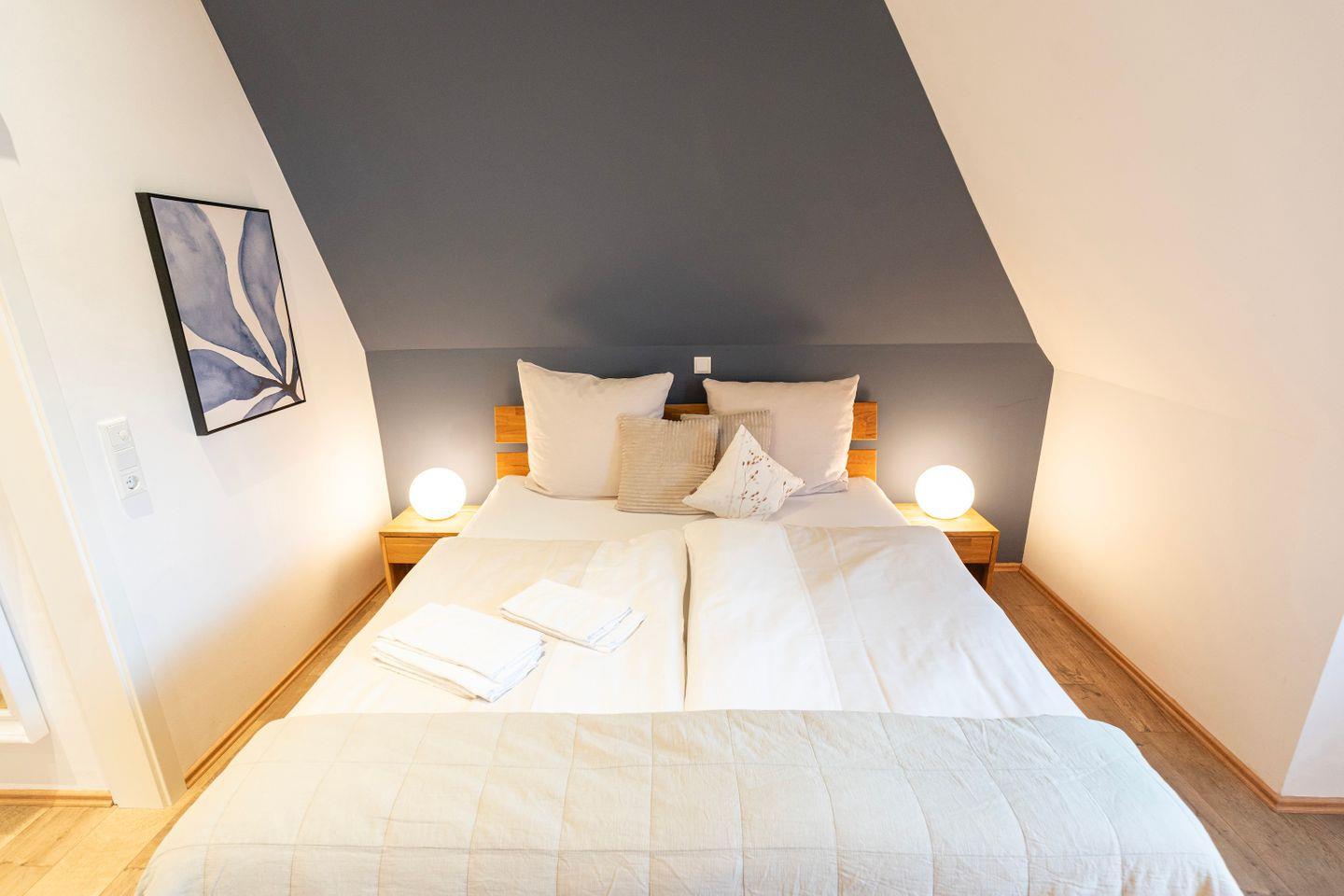 Das erste Schlafzimmer bietet ein gemütliches 1,80m Doppelbett. Im zweiten Schlafzimmer findest du ein bequemes queensize Bett. Im Wohnzimmer befindet sich ebenfalls noch eine Schlafcouch. Hier erlebst Du, ideal für Familienbesuche, einen großen und bequemen Sitzbereich mit Sofa und TV. Zusätzlich gibt es einen Arbeitsplatz mit Schreibtisch und schnellem Internet, perfekt für produktive Stunden oder als Homeoffice.