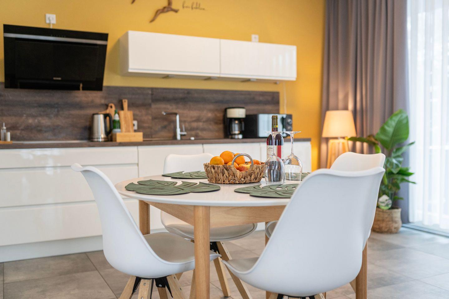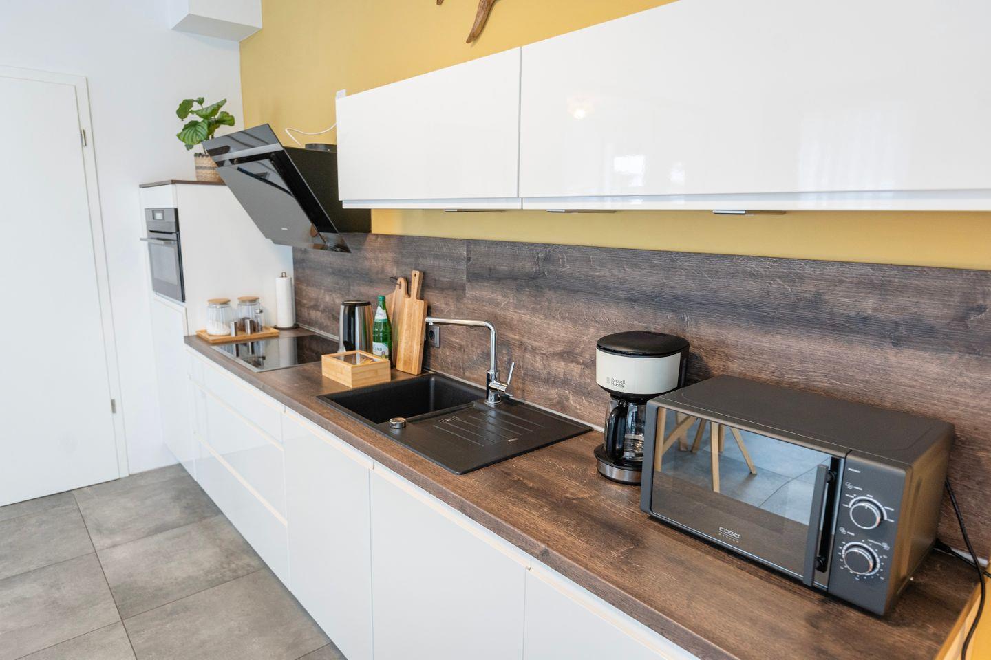 Die Küche ist natürlich voll ausgestattet mit Herd, Kühlschrank, Backofen, Spülmaschine, Mikrowelle und allem was Du sonst brauchst um lecker zu kochen. Das Apartment verfügt ebenso über eine Waschmaschine.