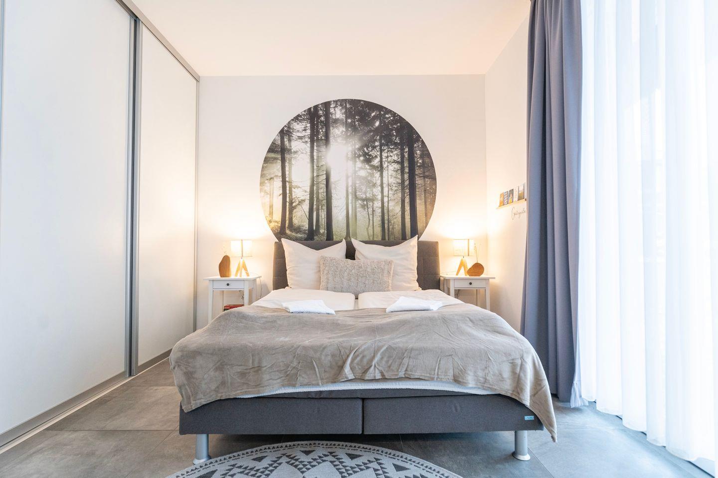 Mit dem Auto kannst Du unsere kostenfreien Stellplätze direkt am Haus nutzen. Dich erwartet ein 59 Quadratmeter großes Apartment mit 1 Schlafzimmern, 1 Bad, Wohnzimmer, Küche und Gäste WC.