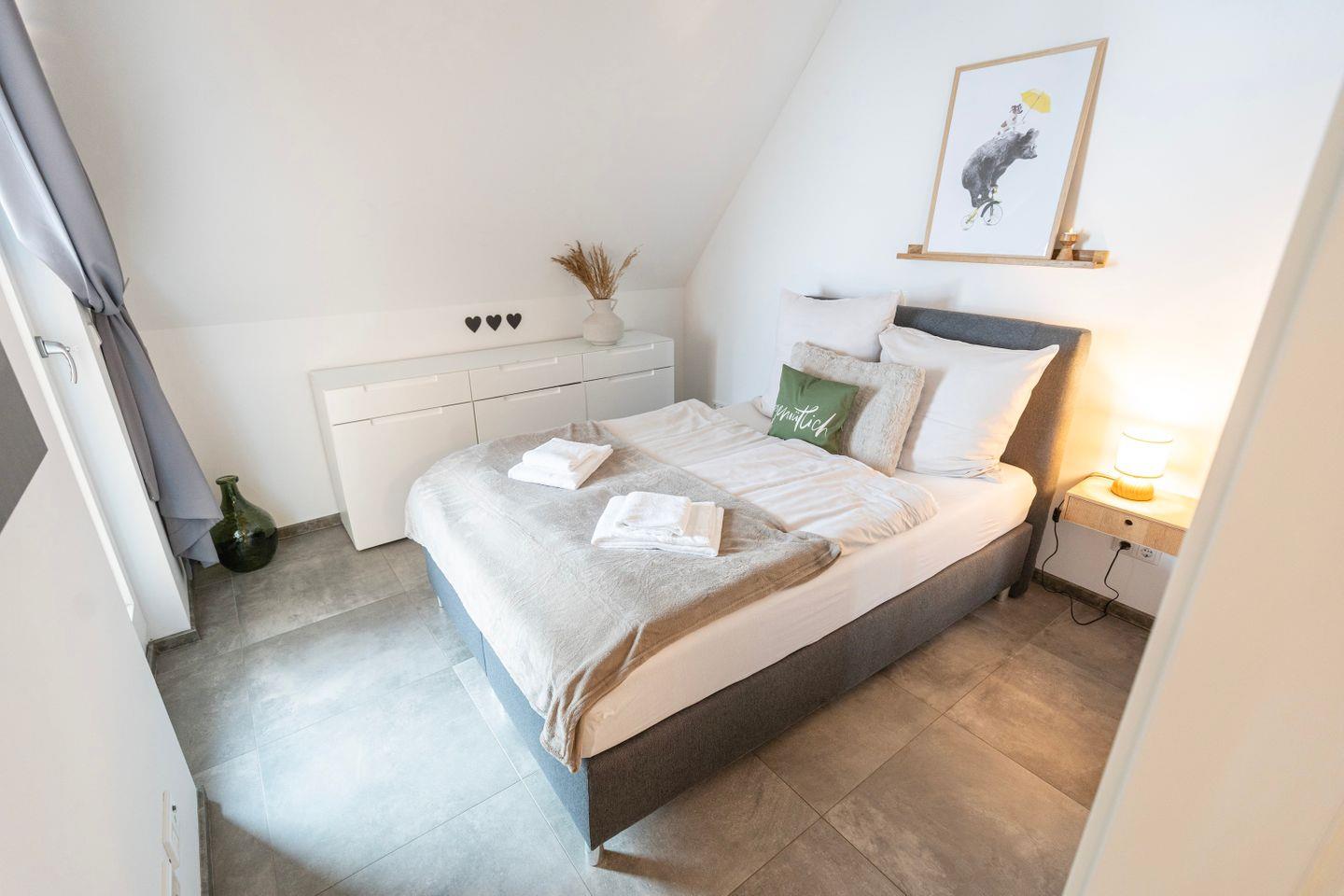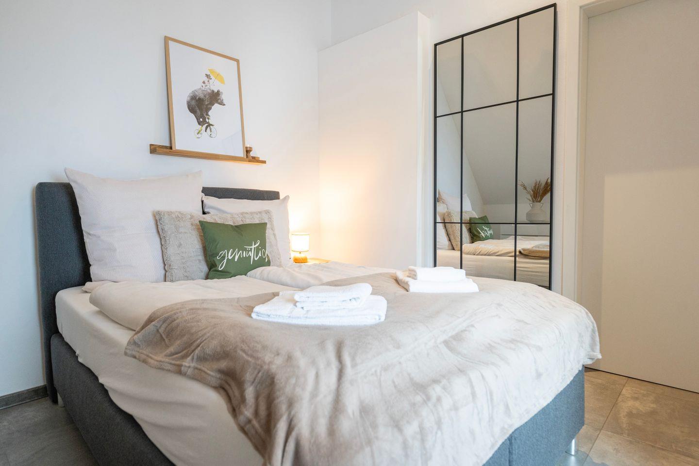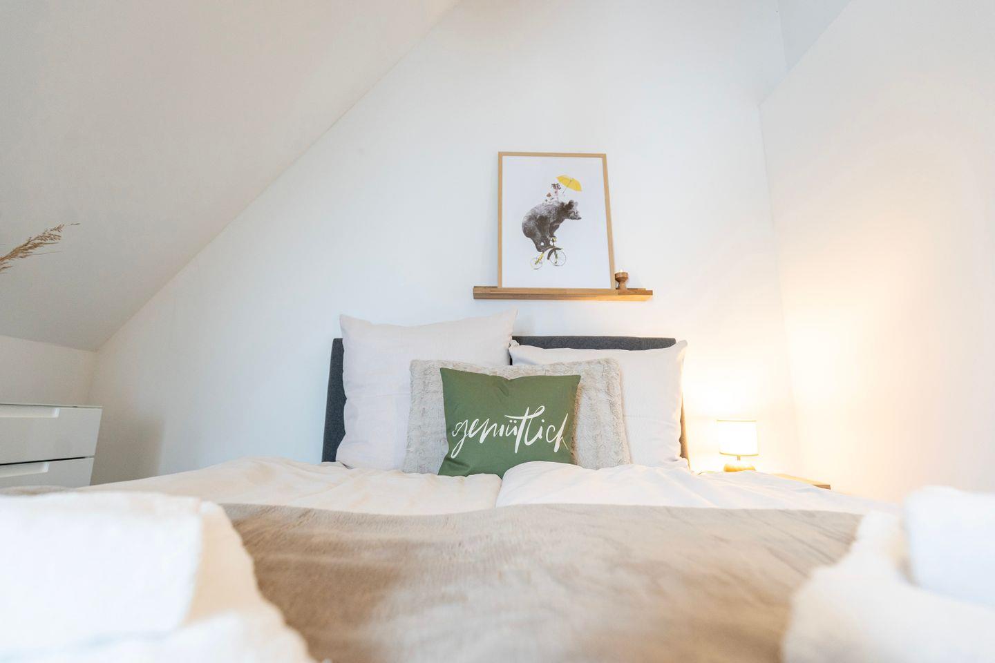 Das erste Schlafzimmer bietet ein gemütliches 1,80m Doppelbett. Im zweiten Schlafzimmer findest du ein bequemes queensize Bett. Im Wohnzimmer befindet sich ebenfalls noch eine Schlafcouch. Hier erlebst Du, ideal für Familienbesuche, einen großen und bequemen Sitzbereich mit Sofa und TV. Zusätzlich gibt es einen Arbeitsplatz mit Schreibtisch und schnellem Internet, perfekt für produktive Stunden oder als Homeoffice.