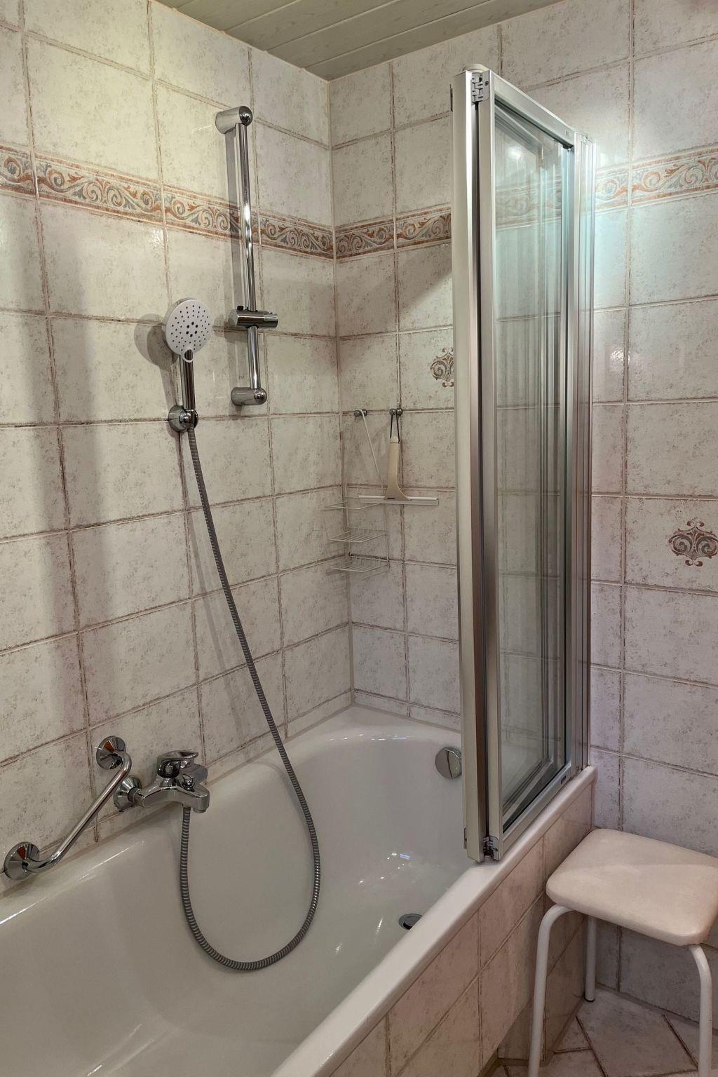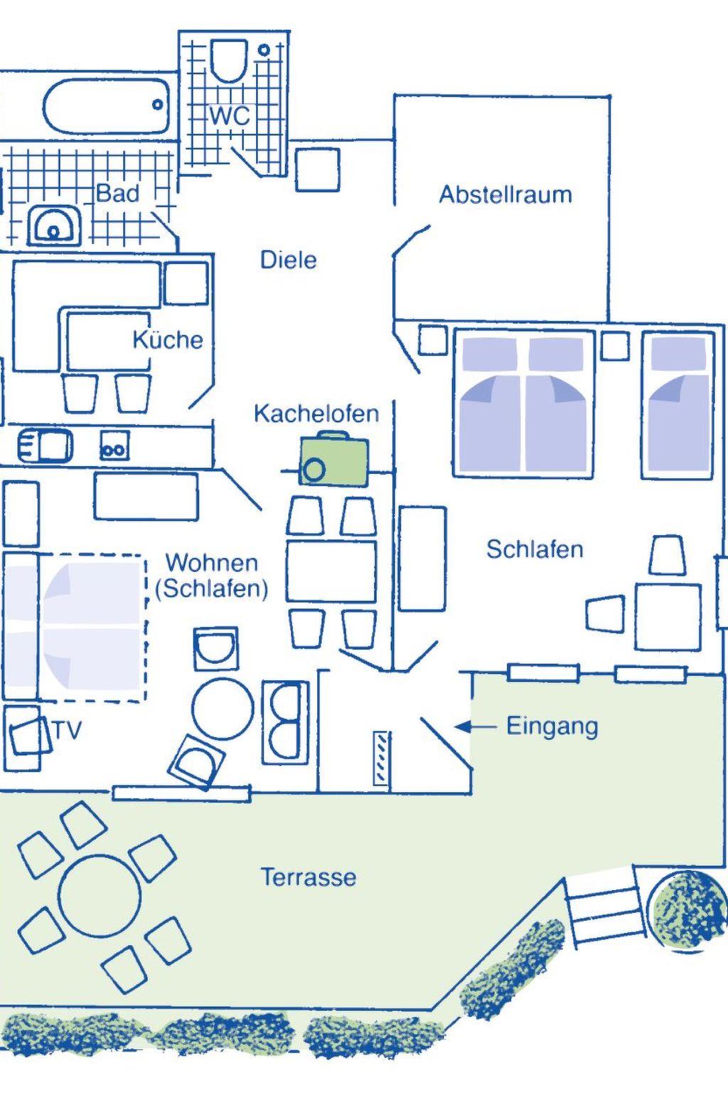 the flat has its own entrance via the lockable terrace,- with 5 steps - 1 bedroom with 1 x double bed 1.80x 2.00 m, 1 single bed 1.80 m long -- living room : 1 living/bedroom with 2 fold-out beds 2.00 m ( fold-out beds )- sofa,- armchair,- coffee table, all at a comfortable sitting height, light spruce wood - cable TV, - stereo system,- telephone free of charge in the German landline network,-- WLAN free of charge,-- kitchen: new spacious kitchen-living room with cosy corner bench, - coffee machine, - microwave, - kettle, - toaster, - mixer, - dishwasher, ceramic hob and oven, - very good crockery and pots (Silit) and much more --- non-smoking flat --- bathroom: shower/bathtub with deeper seat, glass shower wall, washbasin, stool - separate WC, hallway: Wardrobe