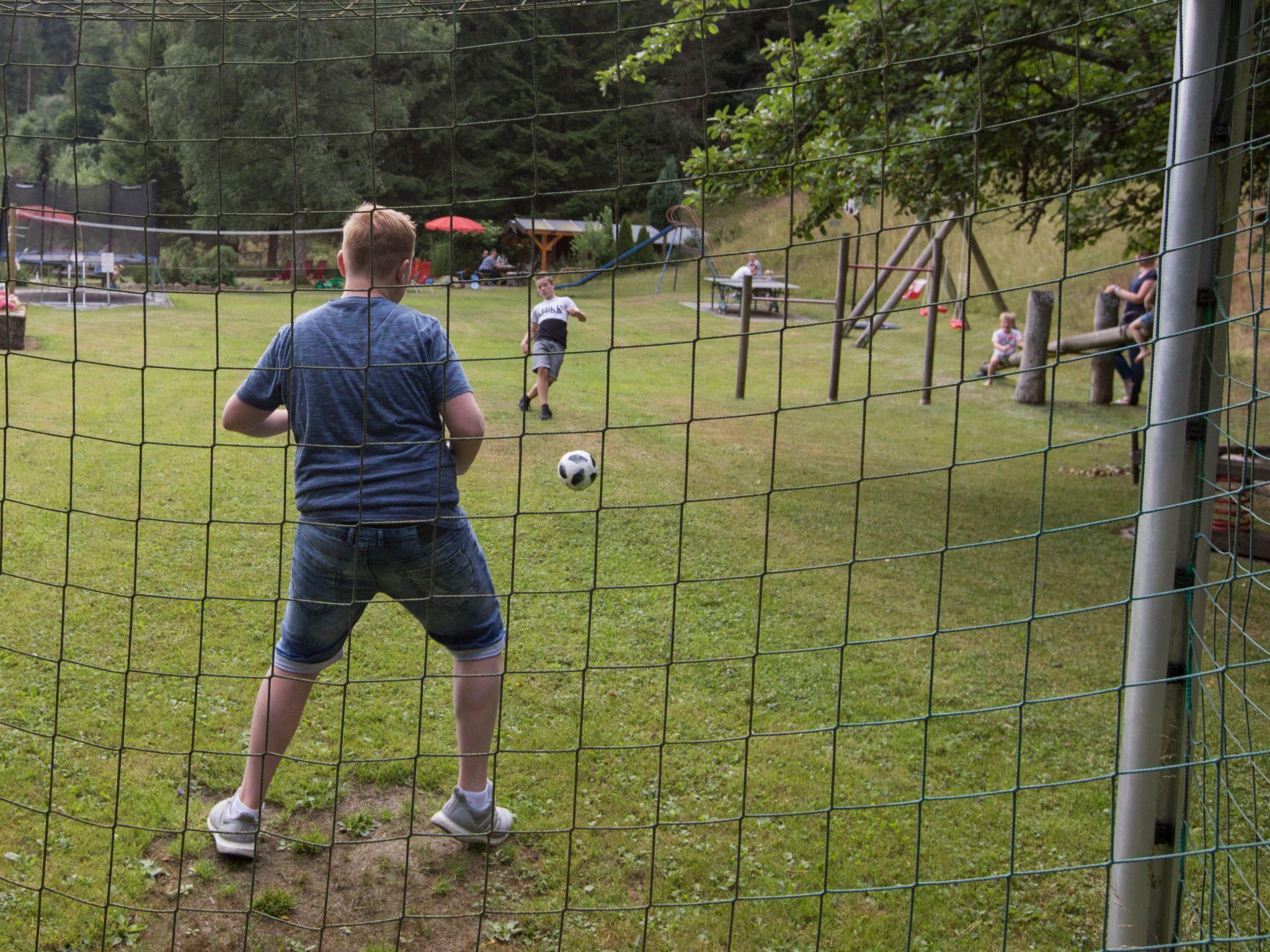 unique leisure meadow over 2000 square metres that is unparalleled, ---the surroundings and the well-being belong together ---for our little guests it is a real paradise with swing, slide, large sandpit, seesaw, children's house. Sandpit, seesaw, children's house, football goal, table football, table tennis, basketball hoop and of course a large trampoline with safety net and many children's vehicles, ideal for playing and splashing in the small Weissenbächle - for the grown-ups - parents can relax on the sun lounger or do something for their health in our natural water treading facility - afterwards you can fortify yourself with a barbecue, a rustic barbecue hut is available for cosy sitting,