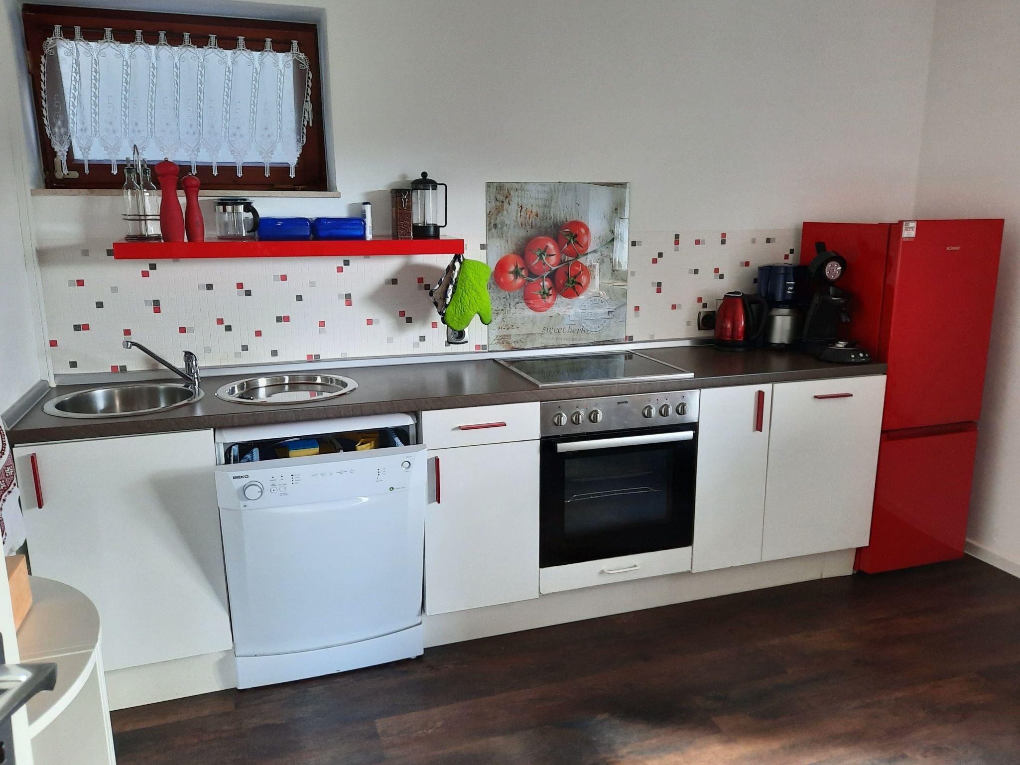 The spacious eat-in kitchen is fully equipped. Complete cooking and eating utensils, glasses and cups, plenty of cutlery, break-proof children's crockery, dishwasher, fridge/freezer combination, microwave oven, oven, 4-ring ceramic hob, 1 coffee machine (Senseo for coffee pods), kettle, egg cooker, rice cooker, toaster and much more leave nothing to be desired. A large collection of cookery books invites you to experiment. Towels, tea towels, dishcloths and cleaning cloths are provided. An initial supply of dishwasher tabs, washing-up liquid, hand soap and cleaning products is available.