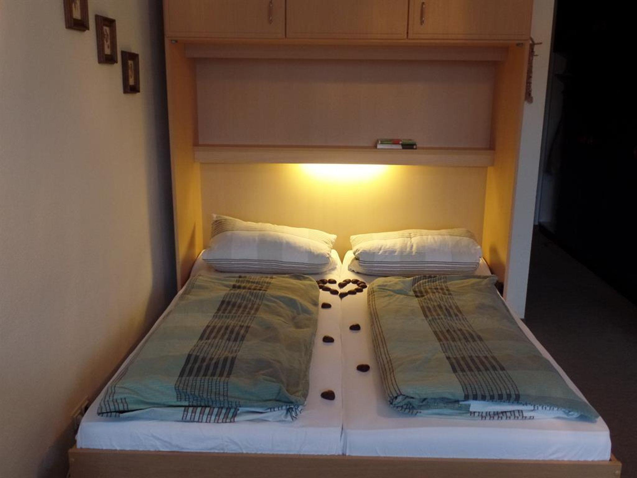 Appartement mit ca. 30 qm. Kleinküchenzeile mit Kühlschrank, Kaffeemaschine, Toaster, Teekocher. Wohn-/Schlafraum mit hochwertigem Doppel-Schrankbett, modernes ausziehbares Schlafsofa, Baby-Bett und SAT-TV. Separates Bad mit Dusche/WC. Überdachter Balkon mit herrlichem Ausblick, Balkonmöbel und Sonnenschirm. Bettwäsche bitte mitbringen; Vierbeiner sind uns leider nicht willkommen.