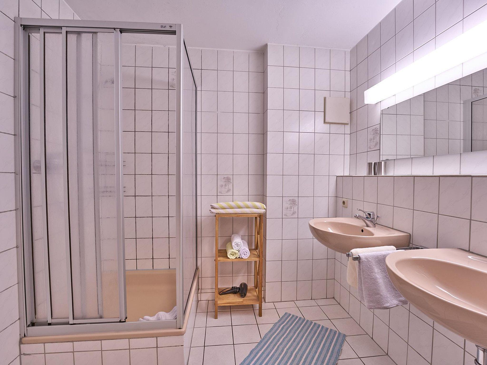 Bad mit Dusche und Doppelwaschbecken (Haarfön), separates WC;